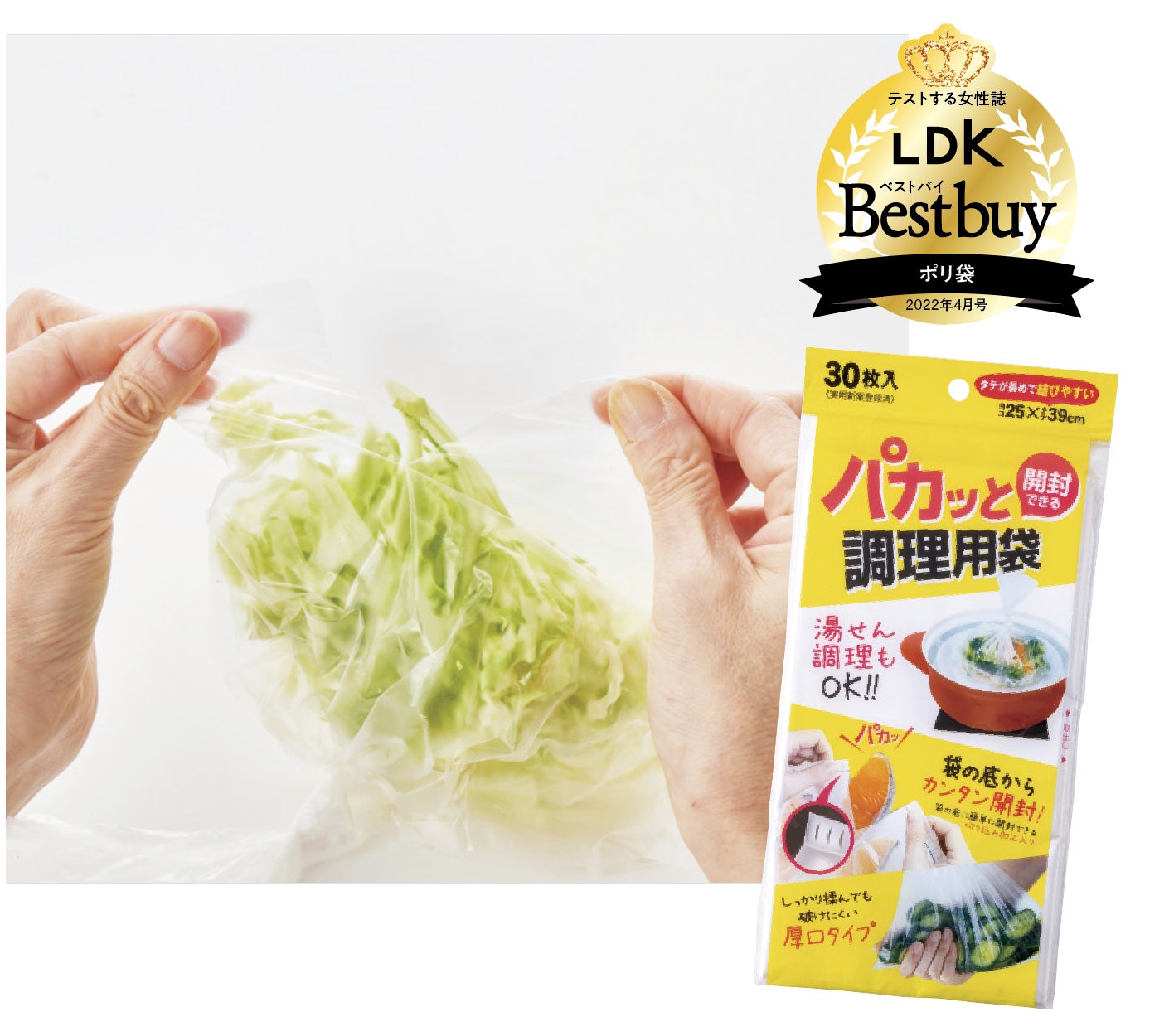 ダイソーやセリアで手に入る「パカッと調理用袋」は鮮度のキープ力がよく、底から食材を取り出せる便利さでベストに。下ごしらえにも活躍します。