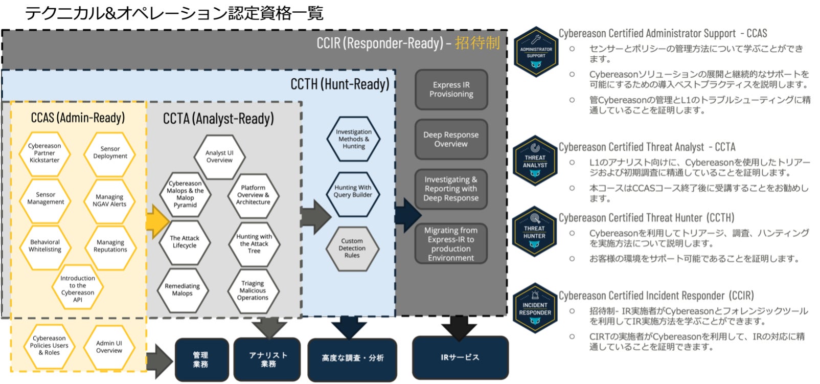 カリキュラムは、OSTechで雇用したエンジニアが、サイバーリーズン提供の認定資格プログラムを受講し、また、実際のSOC(セキュリティ・オペレーション・センター)業務を通じて、 サイバー攻撃対策プラットフォーム「Cybereason」の製品知識やセキュリティ運用のノウハウを学んでいけるように設計。セキュリティエンジニアとして必要な基礎知識を身につけ、プロダクトのトレーニングにシームレスに移行できるような研修を設定しています。中級の認定資格であるCCAS(Administration Support)、CCTA(Threat Analyst)を対象資格とし、CCTAより上位の資格は、希望者の申込みにより試験を実施します。