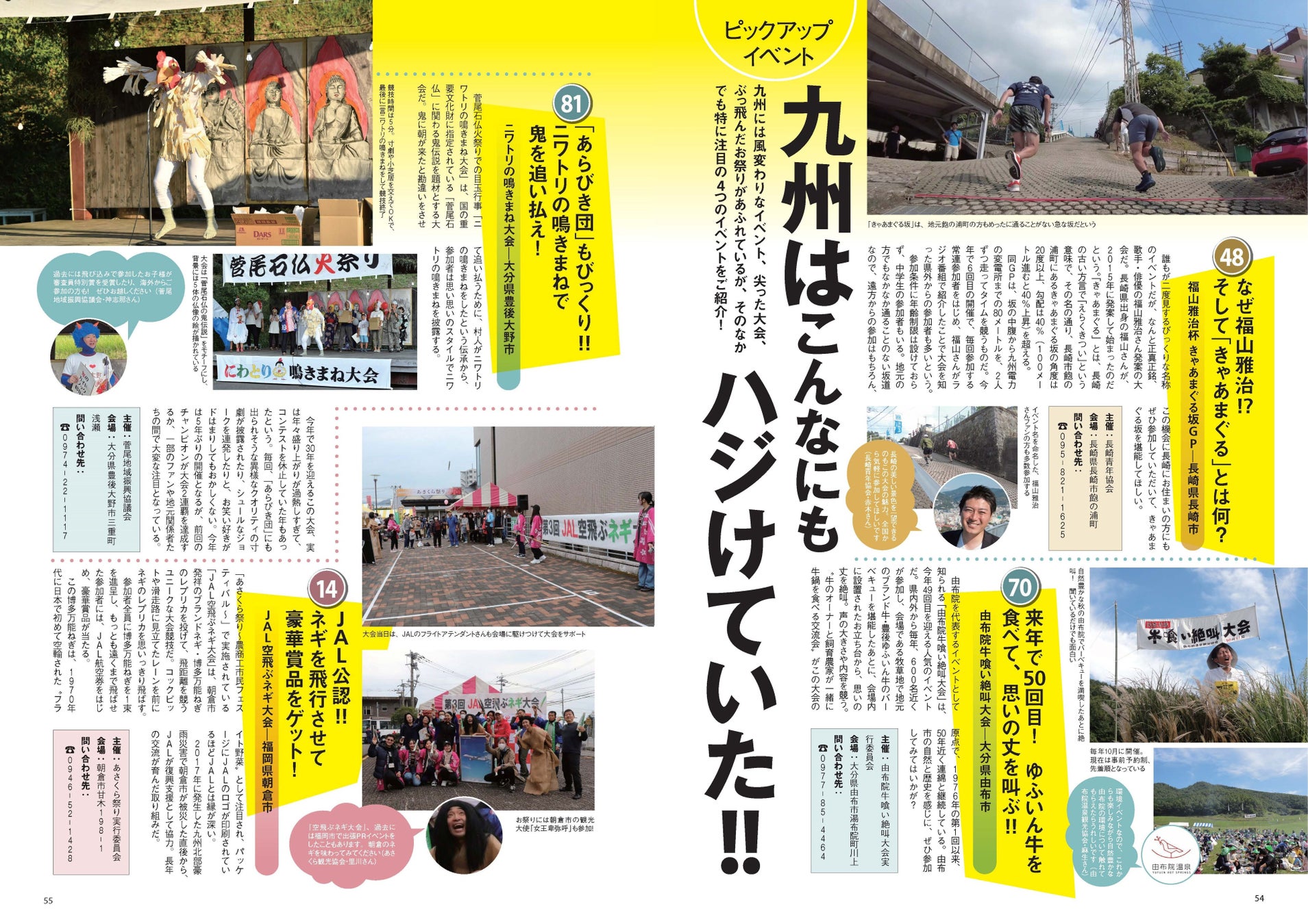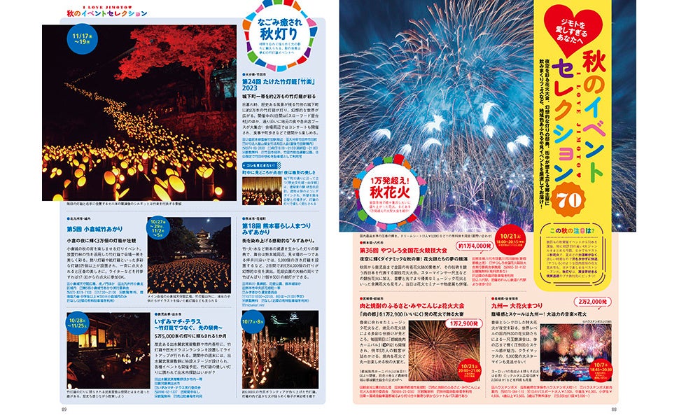 その他、九州各地で開催されている、ちょっと風変わりでクセの強い祭事やイベントだけを集めた特集「笑撃!おもしろ大会100」、秋花火や郷土祭りや灯籠イベントなどを先々まで掲載したカタログ「秋イベントセレクション70」など、行楽シーズンにぴったりな九州おでかけガイドの決定版です。