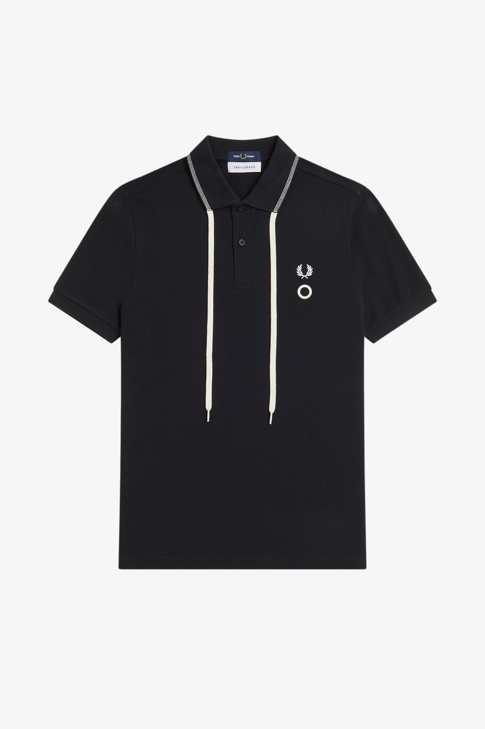 コレクションの起点となるのはフレッドペリーシャツ。スポーツウェアとしての本質は損なうことなくアップデートされ、オリジナルシルエットにアレンジ。ブラックとグリーン2色のポロシャツには、ポロカラーに通されたロングドローコードを採用。機能的なディテールを、精緻なバランスで取り入れています。