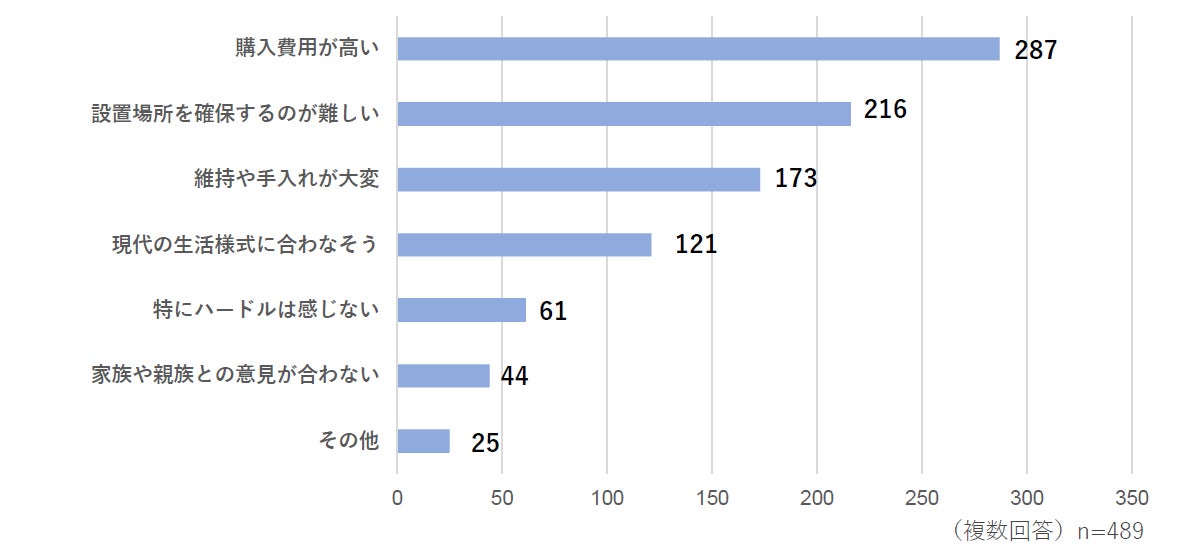 仏壇の購入・設置後に起きそうな問題として、Q3と同様に「 費用が高い(287名) 」が最も多い回答となりましたが、次に多い回答として「設置場所を確保するのが難しい(216名) 」と続き、スペースの制約を感じている方もいることがわかりました。「特にハードルは感じていない(61名)」という回答数からも、仏壇の購入や設置に対して容易ではないイメージがあることが伺えます。