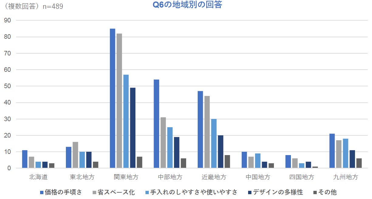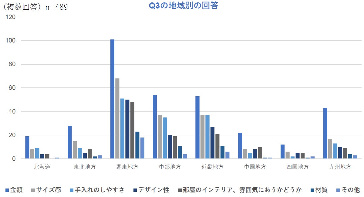 Q3の回答を地域別で比較すると、関東地方や近畿地方では、他の地域と比べ「サイズ感」や「部屋のインテリアとの親和性」などを求める数値が高くでました。比較的人口が多い地域では、居住環境がマンションや家具へのスペースが限られるため仏壇へ求める要素として、そのような利便性も重要視されていることが見受けられます。