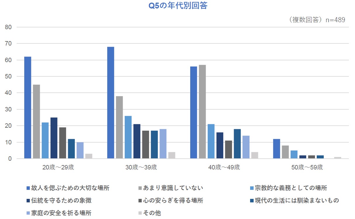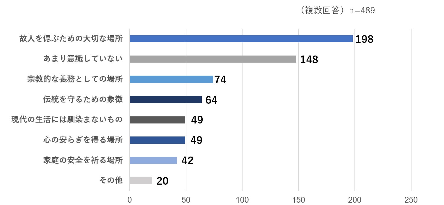 「仏壇」に対する意見として、購入費用や設置場所に関する課題が挙げられる一方で、続いては仏壇に対するイメージを調査しました。Q5では「故人を偲ぶための大切な場所」というイメージを抱くという回答が198名と最も多い意見であることから改めて、日本の古くからの伝統としての仏壇の重要性が伺えます。