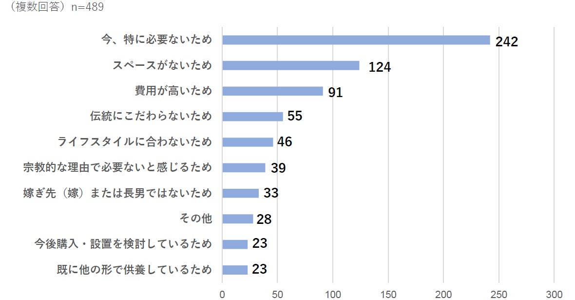 まず、仏壇がない理由として最も多かったのが「今特に必要としていない」という回答で、34.4%(242名)を占めました。次に「スペースがないため」という回答が17.6%(124名)、「ライフスタイルに合わないため」という回答が6.5%(46名)とマンションや自宅の狭小化などの現代の生活様式と従来の仏壇とのミスマッチを懸念する回答が見受けられました。