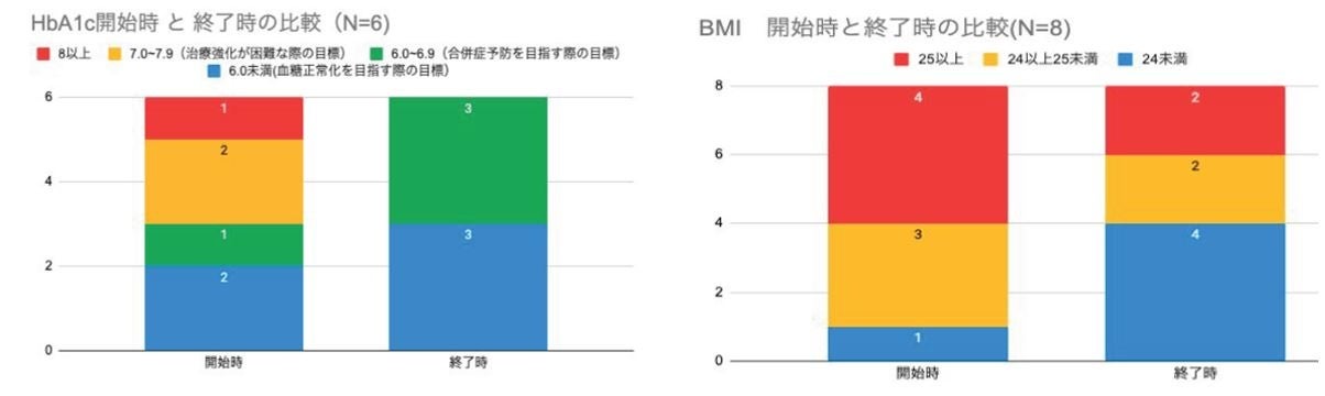 プログラム実施前後共に数値回収ができた6名のうち、4名が改善。全員が合併症予防を目指す際の目標数値(※2)に達し、合併症高リスク者が0になるという結果でした。