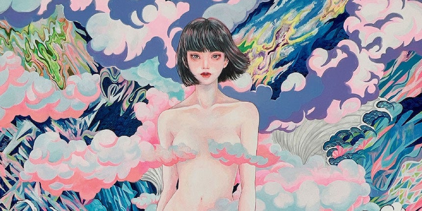北海道出身のMARINAのイラストは、女性のモチーフをメインに華やかなパステルからモノクロ色まで使いこなしまさに唯一無二そのもの。お寺の孫として生まれた彼女の作品は天界から人間世界を見守る女神のような存在、