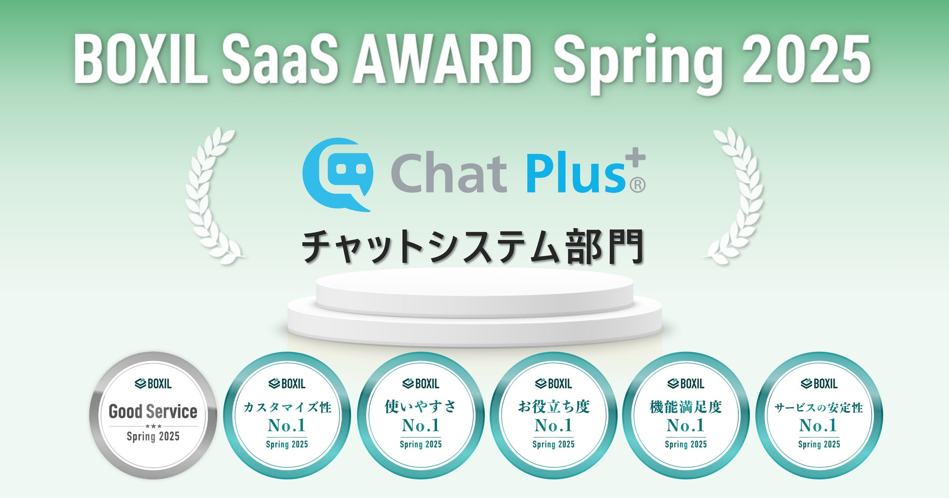 チャットプラス株式会社(本社:東京都千代田区、代表取締役:大江繭子)が提供する生成AI対応のチャットサポートシステム「ChatPlus(チャットプラス)」は、スマートキャンプ株式会社(以下「スマートキャンプ」)が今最も評価されているSaaS(※1)を表彰する「BOXIL SaaS AWARD 2025」においてBOXILセクションチャットシステム部門で1位に選出されました。また、同日に発表された「BOXIL SaaS AWARD Spring 2025」で、チャットシステム部門の「使いやすさNo.1」「Good Service」「機能満足度No.1」「お役立ち度No.1」「サービスの安定性No.1」「カスタマイズ性No.1」に併せて選出されたことをお知らせします。