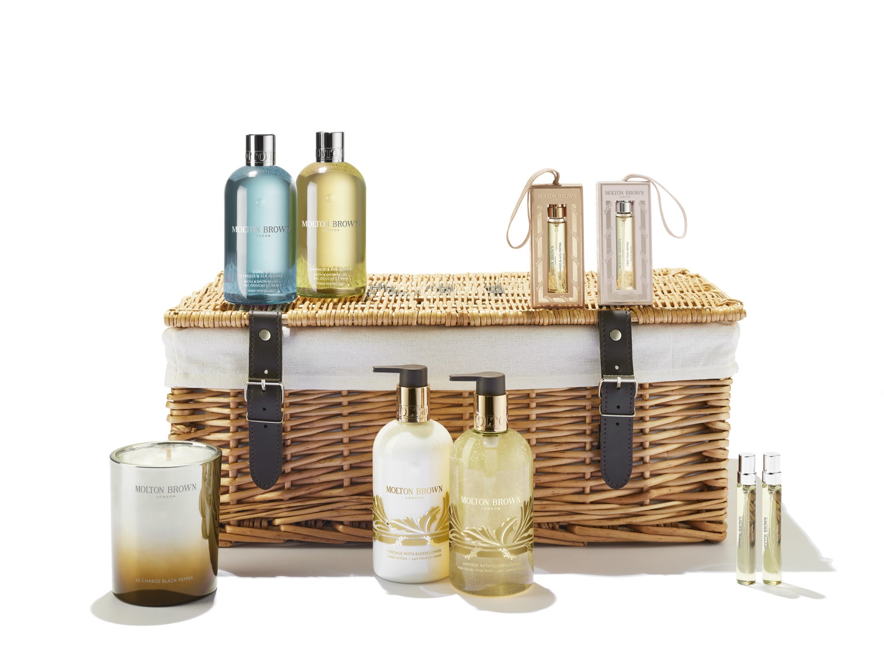 大切な人へ、モルトンブラウンならではの特別なひとときを贈るギフトバスケット。アイコンフレグランスのオードパルファンやバス&シャワージェルに加え、ホリデイ限定のフェスティブヴィンテージ エルダーフラワーのハンドケアなど、厳選されたアイテムを詰め合わせました。香りに包まれる贅沢な時間を届ける、ラグジュアリーなホリデイギフトです。