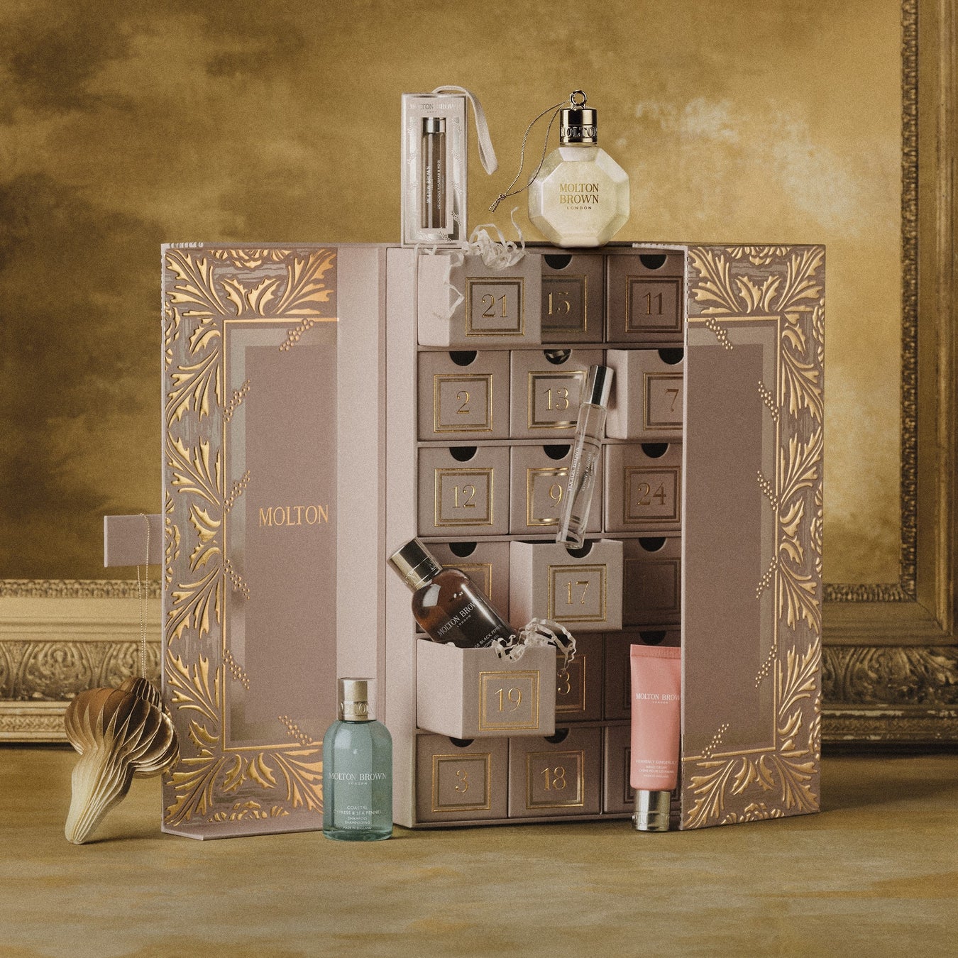 年に一度だけ登場する、モルトンブラウンの特別なコフレ「アドベントカレンダー」。煌めく額縁を思わせる限定ボックスの中には、人気のボディケア、ヘアケア、フレグランスなど全24品を豪華に詰め合わせました。引き出しをひとつずつ開けるたびに、香りとともに心が華やぐホリデイシーズンを演出します。ご自身へのご褒美としてはもちろん、ご家族やご友人と一緒に開けて楽しむことで、特別なひとときを分かち合えるアイテムです。
