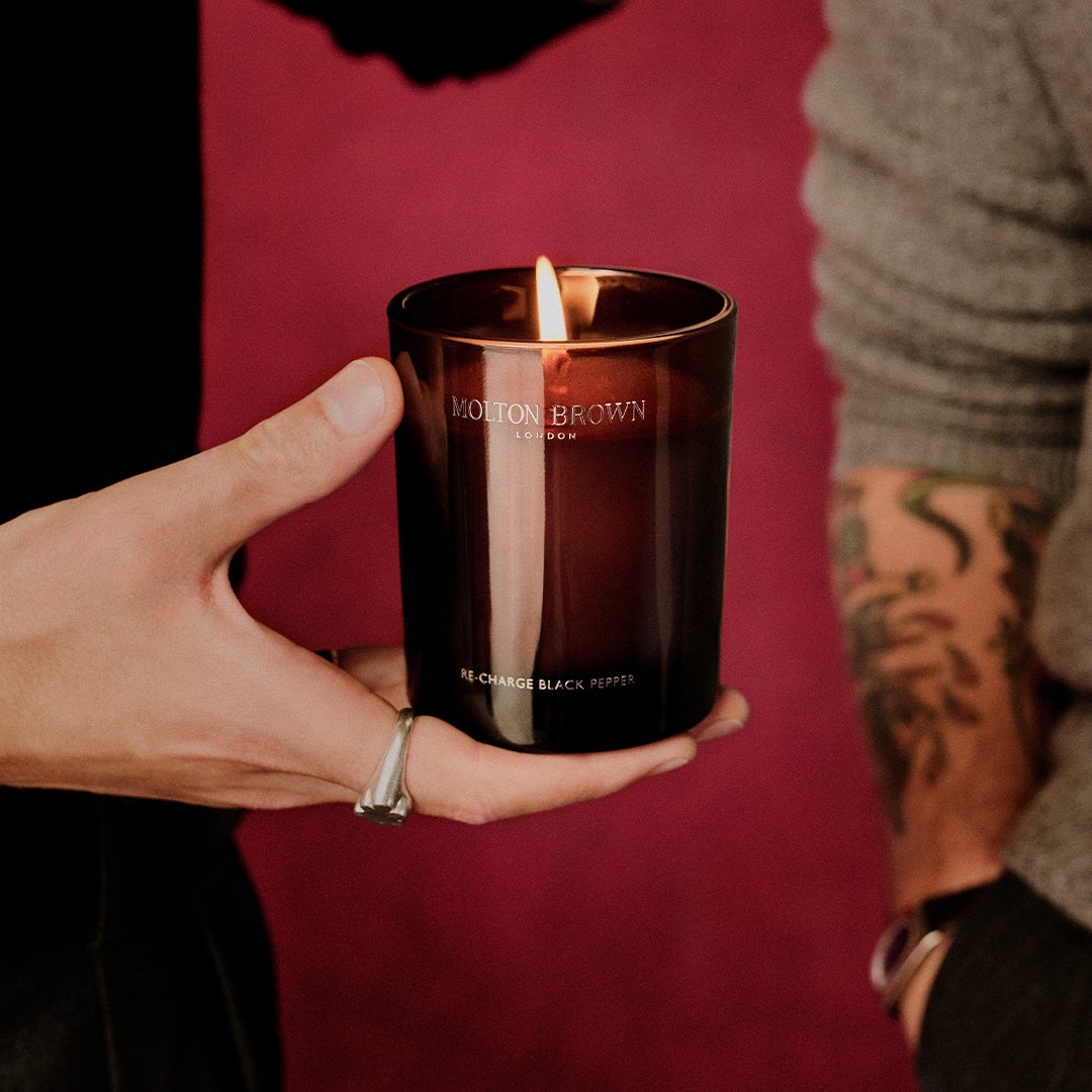 ホリデイシーズンを祝福する、ブラックペッパー コレクションからの特別なキャンドル。容器は、1970年代のモルトンブラウン創業時のヘリテージに着想を得たメイフェア・エボニーに、煌びやかなアクセントを添え、ホリデイインテリアを華やかに彩ります。