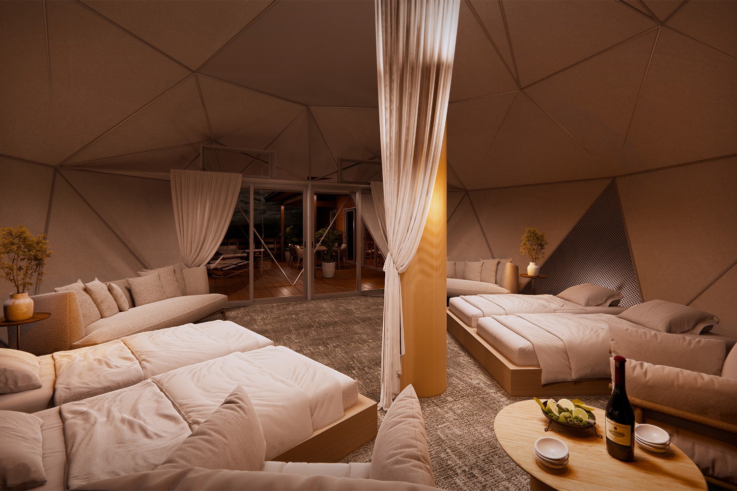 グループや大人数旅行にも最適な2LDKの広い間取りのヴィラタイプ。直径7mの大型ドームテント。エアコン完備の広々とした快適なお部屋には非日常を演出するインテリアを配置しております。