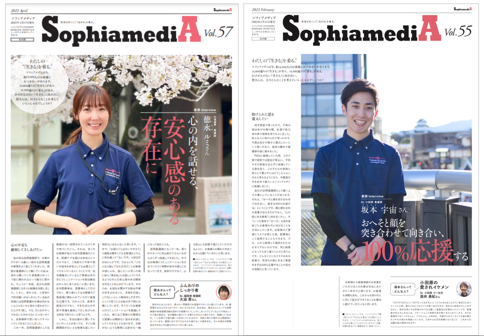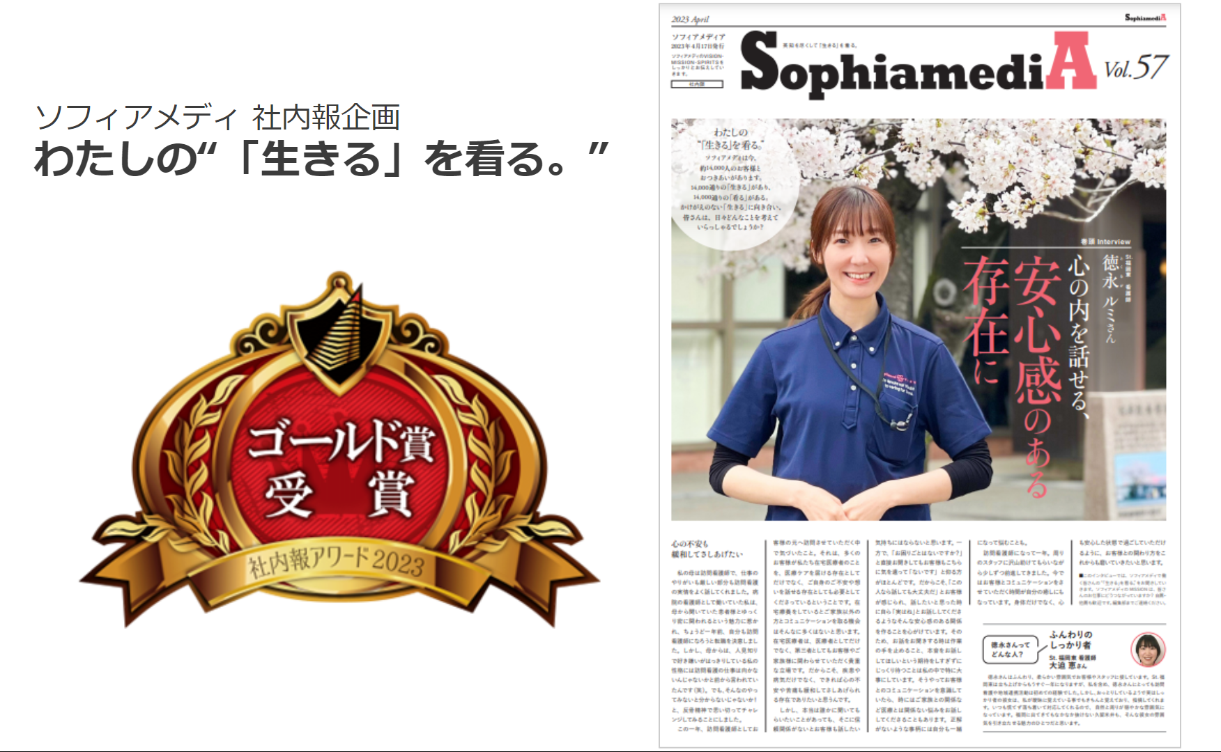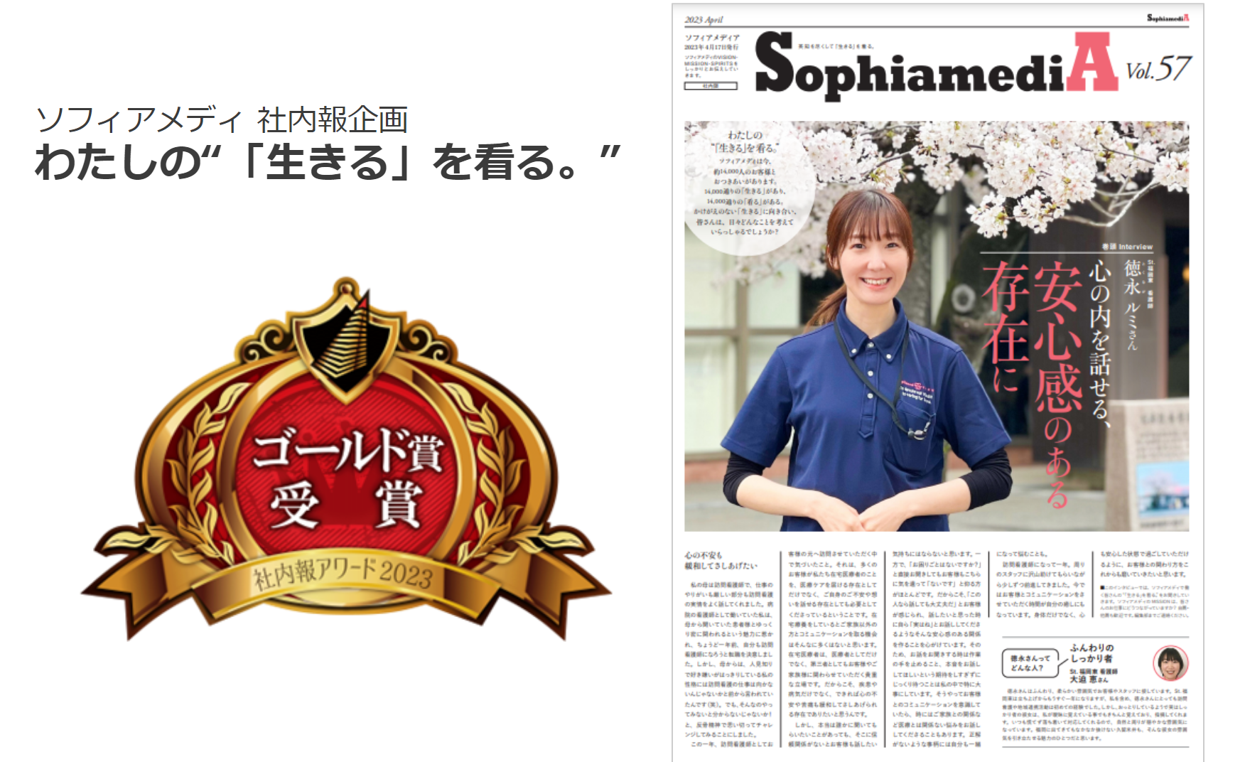 今回受賞したのは、巻頭インタビュー「わたしの“『生きる』を看る。”」で、取材対象社員の看護観を紐解き、ミッションと照らし合わせながら語る企画です。このインタビューを読むことで、社員が自身の看護観をより深めること、それをお客様への高品質なケアにつなげることを目指して制作しています。