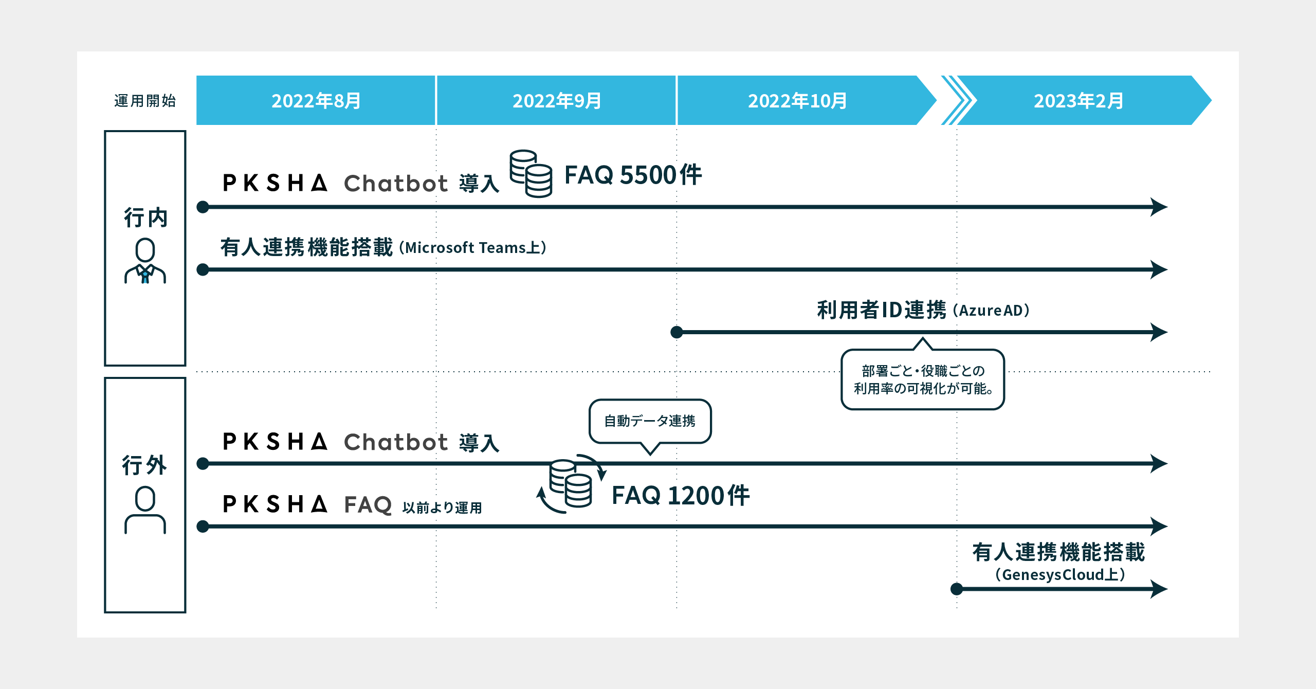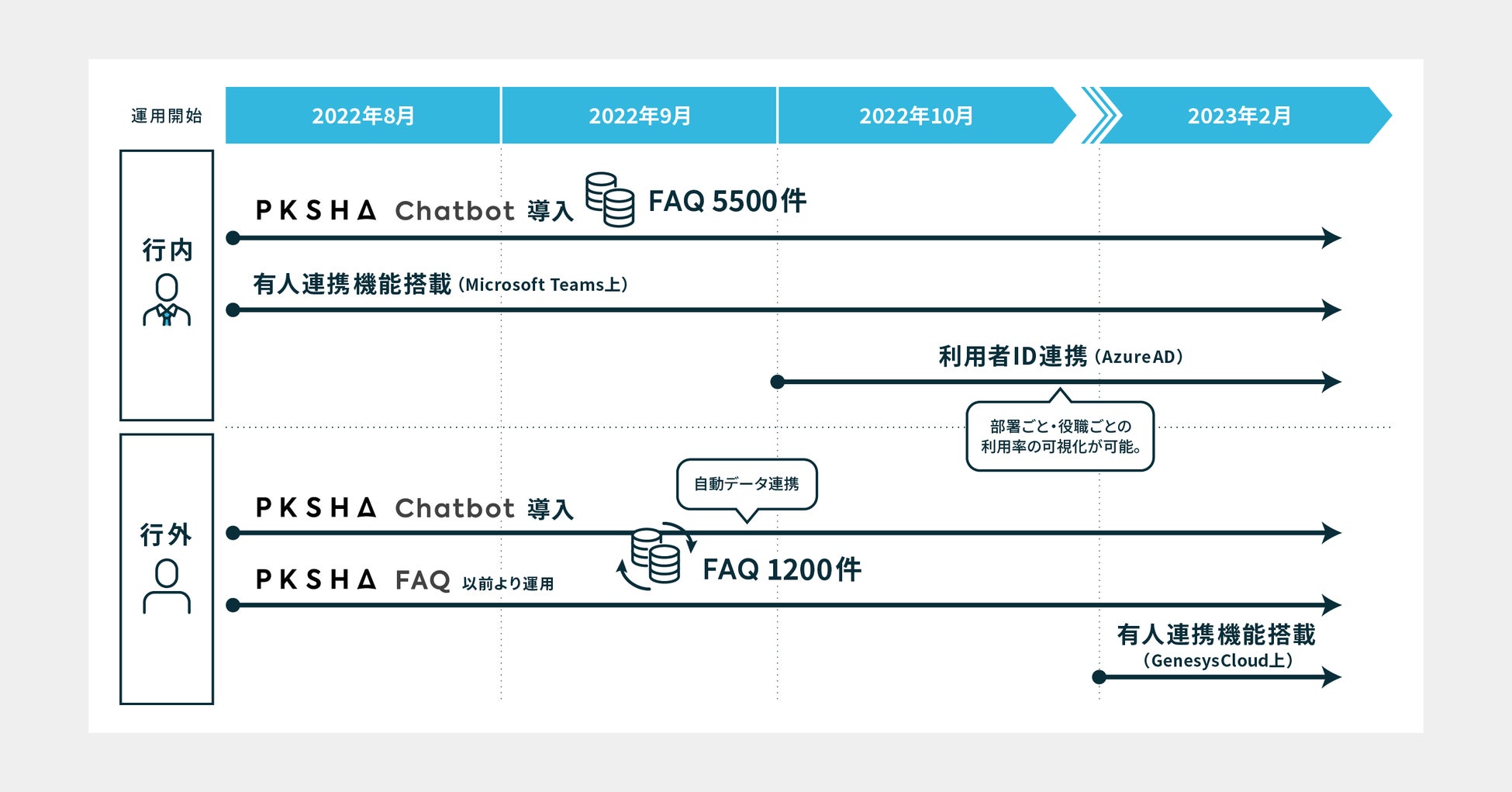 お客様向けのコミュニケーションは、以前より導入されていたPKSHA FAQによるFAQページも頻繁に活用されており、新たに導入したPKSHA Chatbotを、そのデータベースに連携することにより回答内容の自動アップデートも可能となりました。チャットボットのWebサイト上での接点を、今までの3倍である約60ページに拡張した上で利用率向上を目指し、社内と同様お客様向けにも有人連携機能もリリースしました。