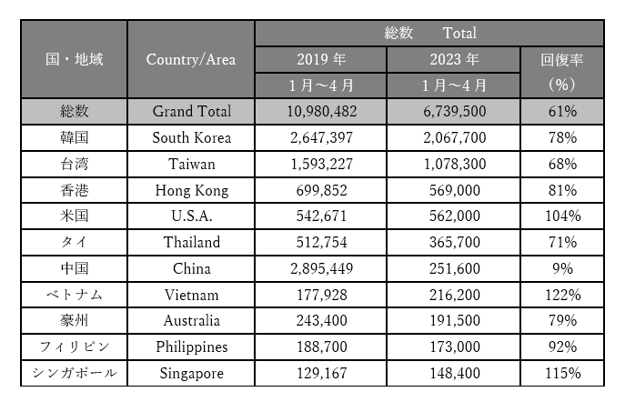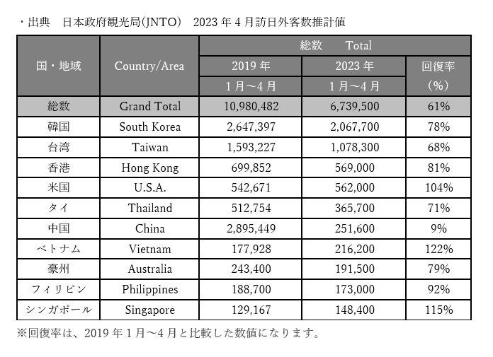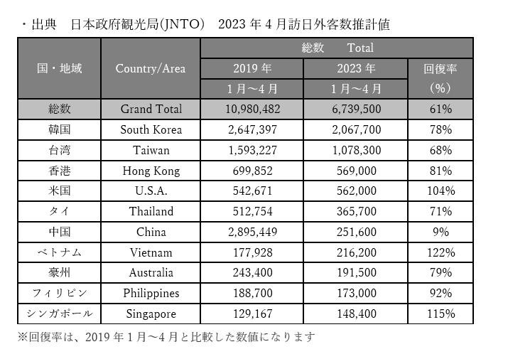 日本政府観光局がまとめた2023年4月の訪日外国人数(推計値)は、先月181万7500人から約13万人増加の194万9100人に上りました。2022年10月の政府による水際対策緩和以降、月間の訪日外国人数は更新し続けており、現在コロナ禍前の60%を越える水準まで回復しています。これから中国本土からのインバウンド観光客が本格的に戻ってくる事を鑑みると、ますます外食業界にとってインバウンド観光客を戦略的に取り込んでいく事が今、求められています。