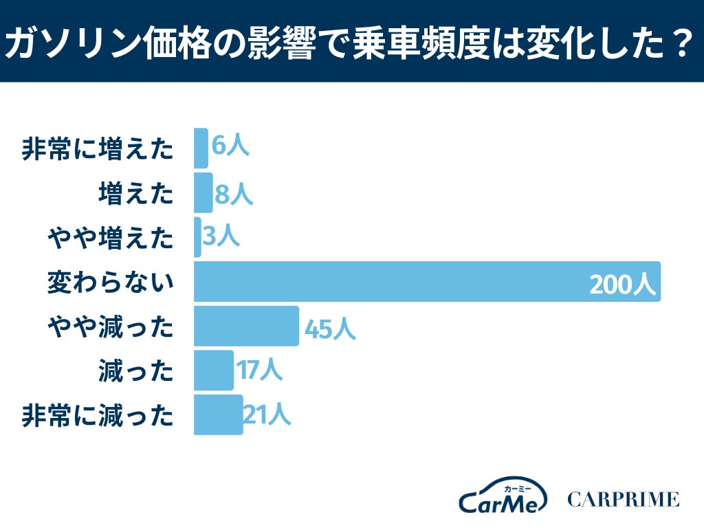 一方、クルマに乗る頻度が「非常に減った」「減った」「やや減った」と答え方も合わせて83名おり、一定の影響があった方もいるようです。