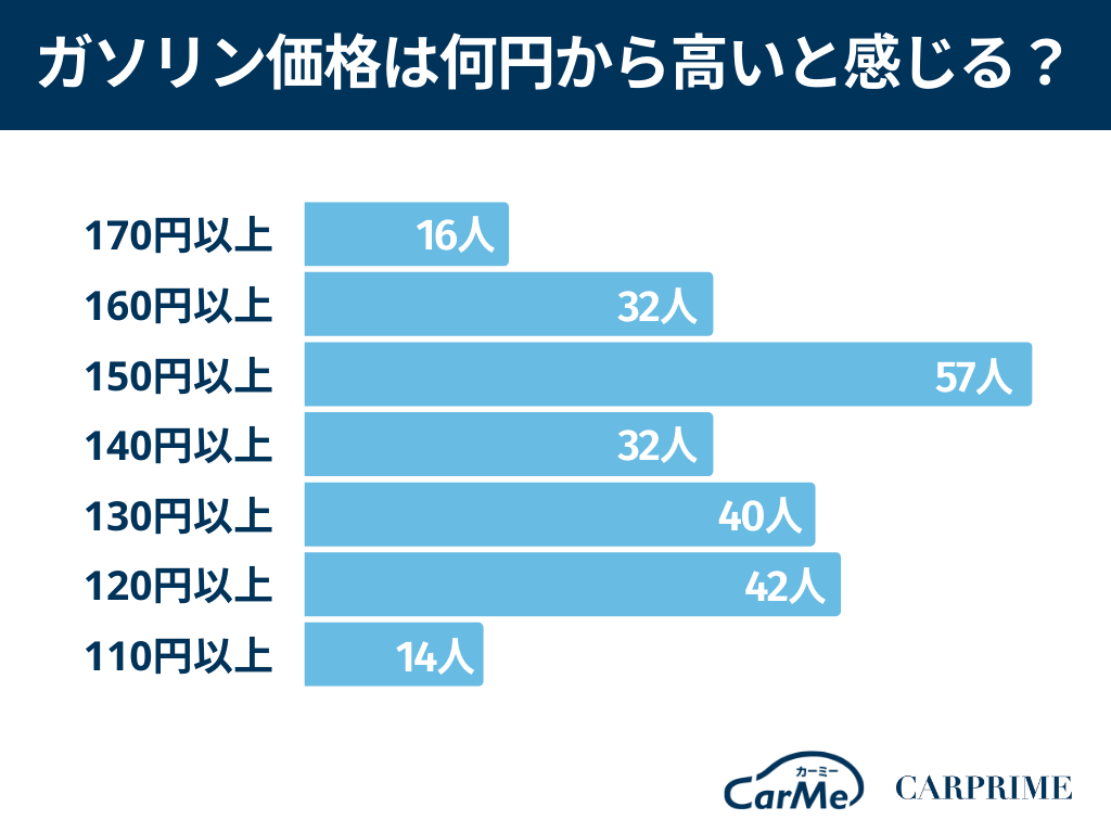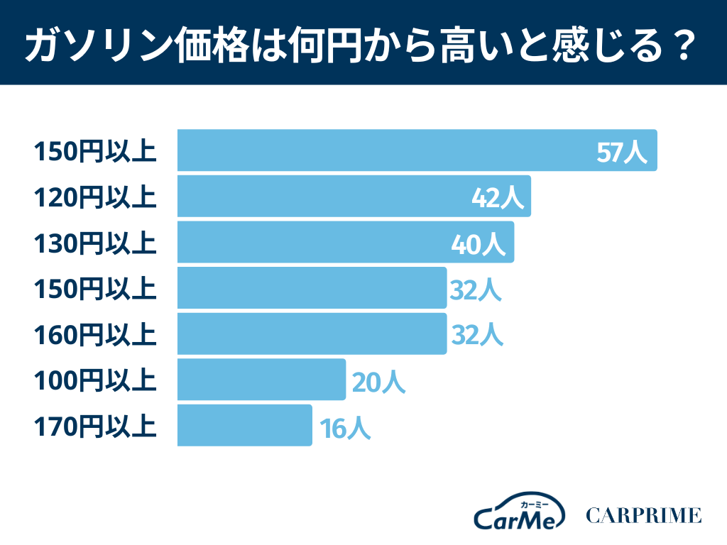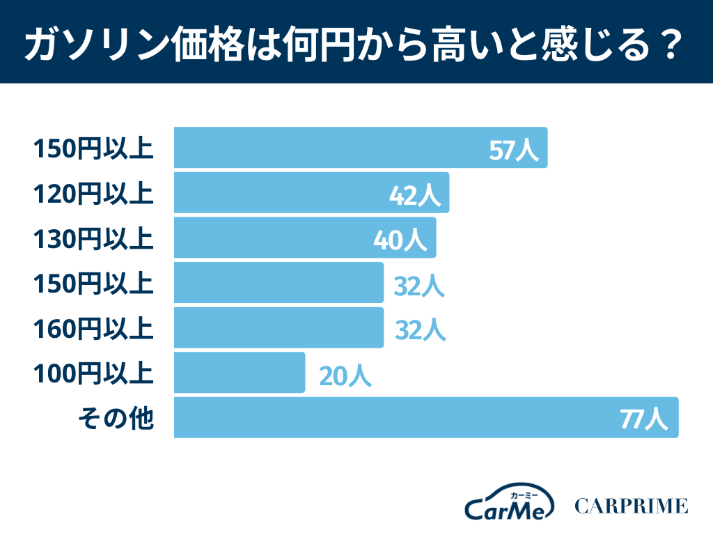ガソリン価格は区切りとしてわかりやすい「150円以上」が高いと感じる方が57名で最多でした。