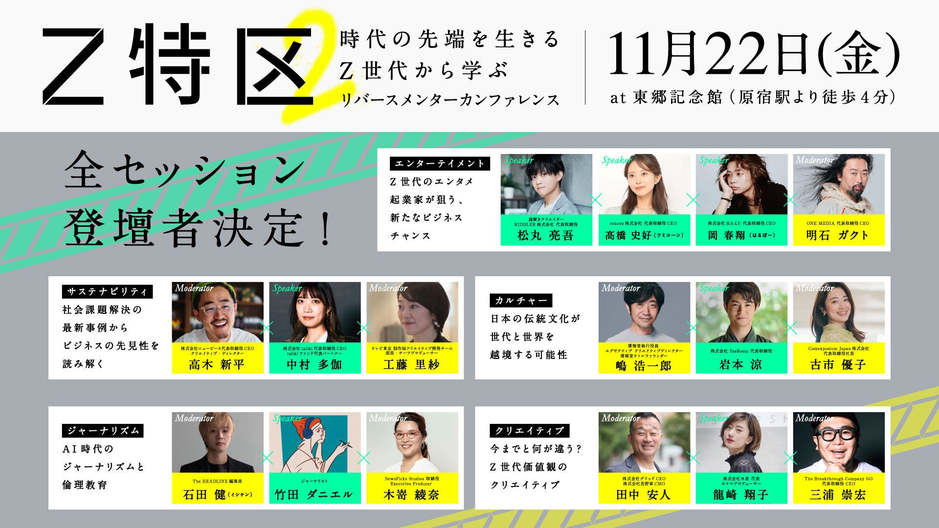 The Breakthrough Company GO(東京都港区、代表取締役 三浦崇宏、以下GO)は、年長者が若者から社会や未来について学ぶ、通常のメンターとは真逆の構造のリバースメンターという仕組みを社会に広めていくために、リバースメンター・カンファレンス『Z特区』の第二回目を11月22日(金)に東郷記念館(東京都渋谷区)で開催いたします。今回はすべてのセッション・登壇者の確定をお知らせいたします。
