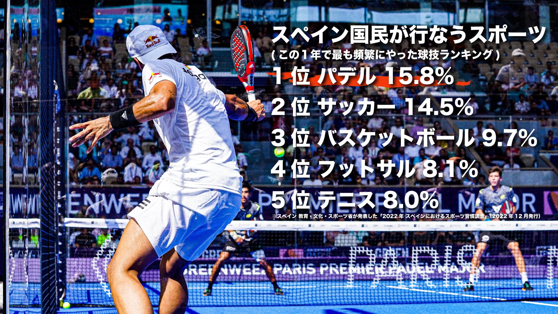 2022年現在全世界90カ国以上に約5万コート、競技人口2500万人、とりわけスペインではサッカーを抜いて国内第1位となる競技人口を持つなど、ヨーロッパを中心に世界各国で人気急上昇中のニュースポーツとして幅広い年代に親しまれています。特徴としてテニスコートよりも小さなコートの四方を強化ガラスと金網で覆われた2人組対戦のみのラケットスポーツということが挙げられます。ポイントの数え方や試合進行はテニスと同じですが、壁面のバウンドを活用したダイナミックながらも戦略的な頭脳プレーが魅力なスポーツです。また、小さいコートや扱いやすいラケットためスポーツ初心者や、子供や高齢者などレベルを問わず楽しむことが可能です。フィジカルを問われなければ、男女や親子三世代で勝負を楽しむこともできます。
