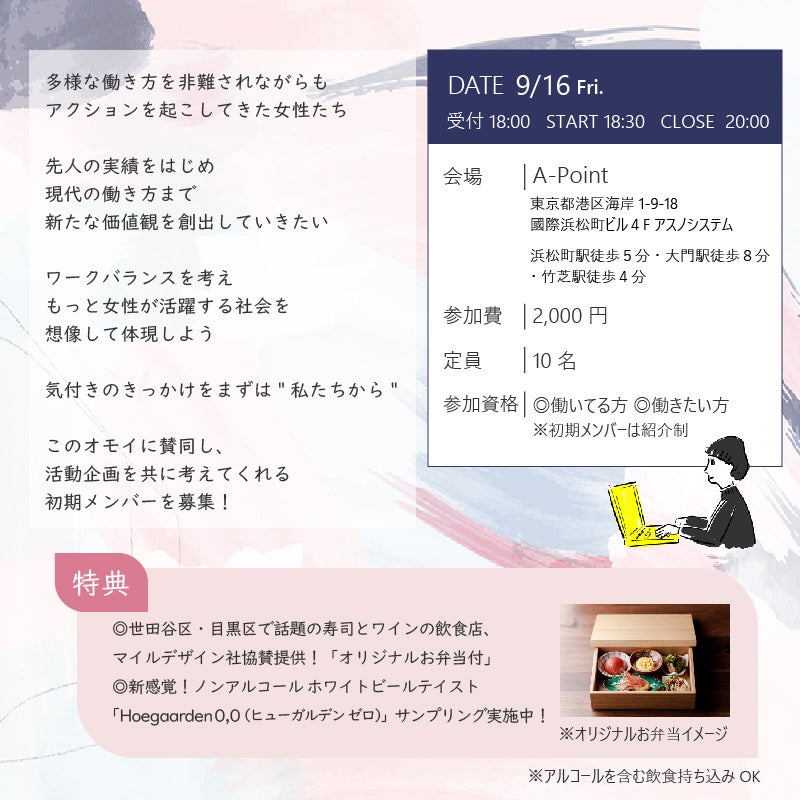 本交流会は業界業種問わず、「働く私たちの女子会」をテーマに多様な働き方や非難を恐れずアクションを起こしてきた女性たち先人の実績をはじめ、現代の働き方まで新たな価値観を創出していくためのワークバランスを考え、もっと女性が活躍する社会を想像して体現しようという気付きのきっかけ作りを目的に実施いたしました。