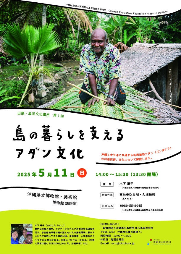 一般財団法人 沖縄美ら島財団(所在地:沖縄県本部町)は、2025年5月11日(日)に、出張・海洋文化講座「島の暮らしを支えるアダン文化」を沖縄県立博物館・美術館(沖縄県那覇市)にて開催いたします。本講座は、海洋博公園内にある海洋文化館が所蔵する資料をもとに、アジア・オセアニア地域の海洋文化を広く紹介する取組の一環として実施されるものです。今回のテーマは、沖縄をはじめとする太平洋の島々で暮らしに密接に関わってきた有用植物「アダン(パンダナス)」です。講師は当財団総合研究所の木下靖子研究員となり、アダンの文化的意義や活用技術についてわかりやすく解説します。アダンは、かつて日常生活の中で広く活用されていた植物であり、その利用法には先人の知恵が詰まっています。本講座を通じて、地域文化や自然との共生について理解を深める機会となることを目指しています。