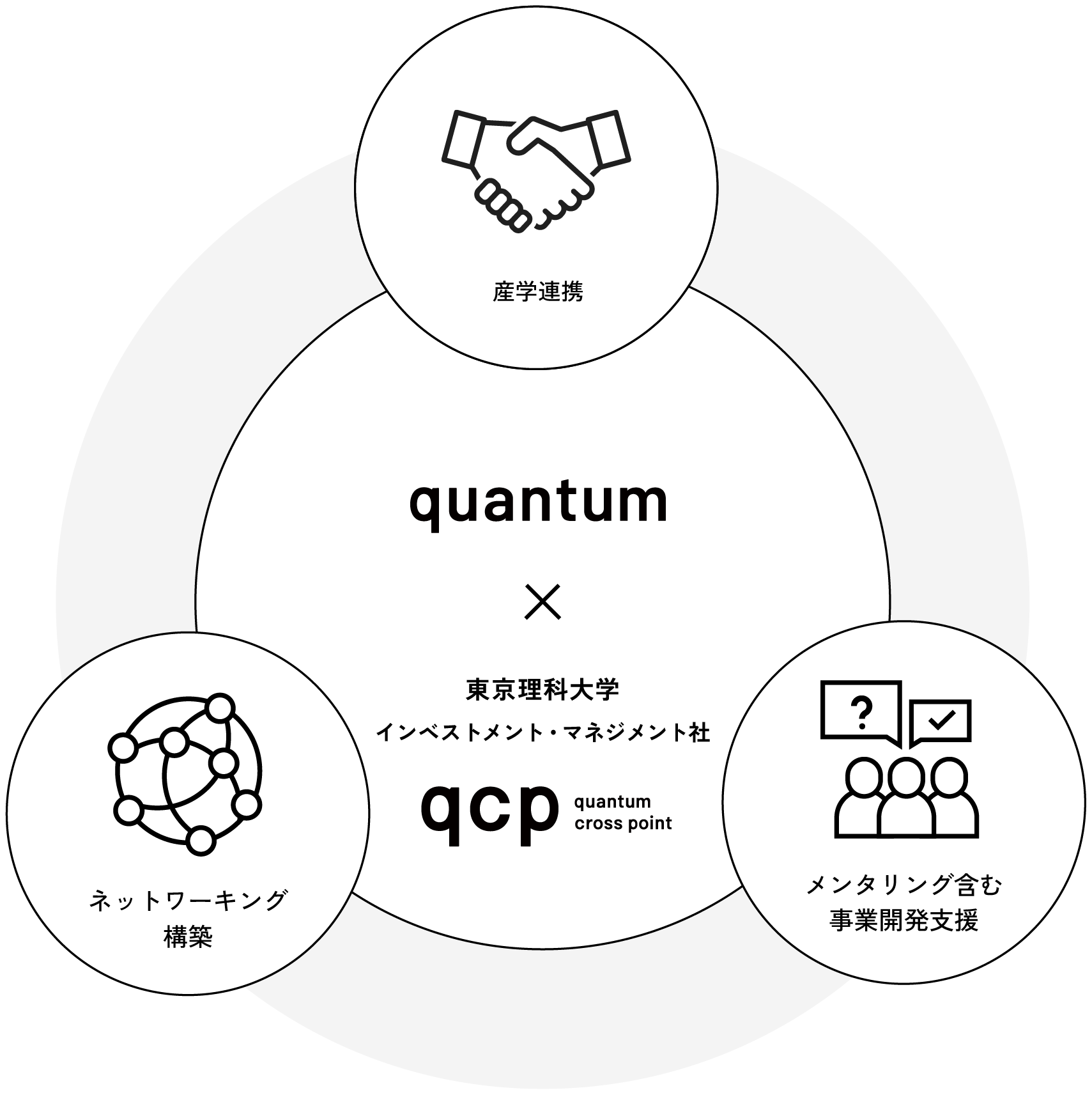 東京理科大学インベストマネジメントとスタートアップ・スタジオのquantumの共同運営により、スタートアップや新規事業開発を多角的な支援を行います。アクセラレータープログラムやビジネスピッチだけでなく、産学連携、事業開発支援、CxO人材の紹介やネットワーキングまで、イノベーション創出を全面的にサポートします。