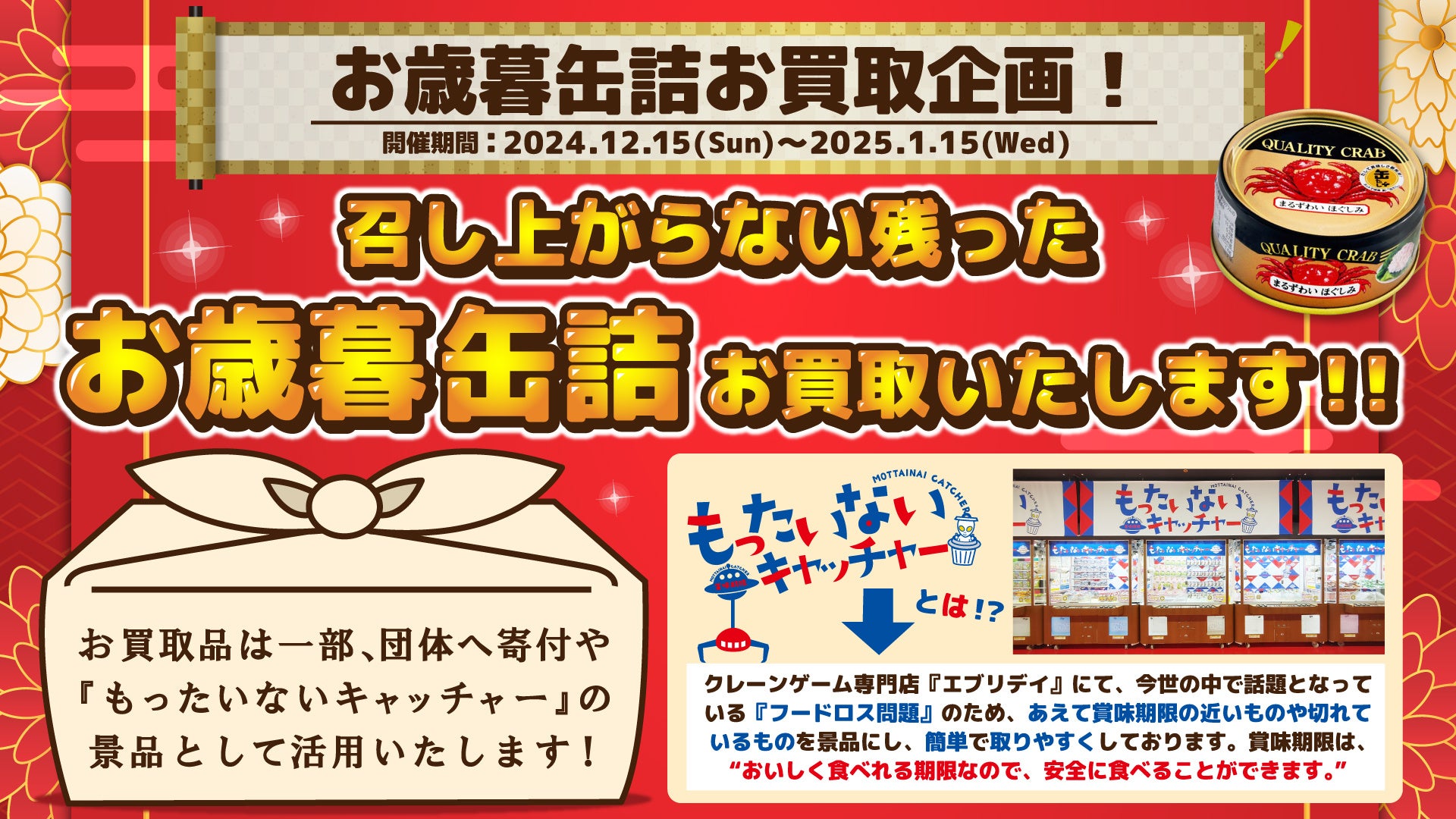 「笑顔創造」が企業理念の株式会社東洋(本社:埼玉県北本市 代表取締役/中村秀夫 以下、当社)が運営する、埼玉県内8店舗展開の、ブランド品や貴金属・ジュエリー等の買取店「エブリデイゴールドラッシュ」は、召し上がらずに残っているお歳暮缶詰品を、未開封であれば、種類・賞味期限に関わらず、2025年1月15日までの期間限定で、どんな缶詰でも1個100円で買取致します。