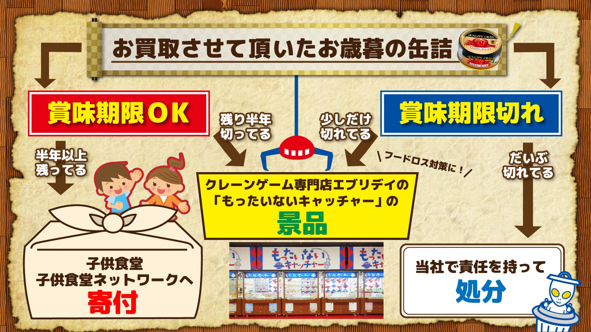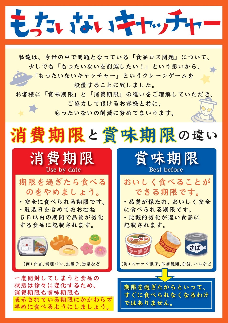 賞味期限が半年を切ってしまっているものは、子供食堂や子供食堂ネットワークへ寄付が出来ない為、当社、別事業部で運営のクレーンゲーム専門店『エブリデイ』にて展開中のフードロス対策・SDGs貢献のクレーンゲーム【※もったいないキャッチャー】で景品として使用させて頂きます。