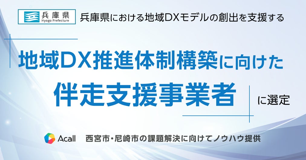 ワークテック企業・Acall株式会社(本社:神戸市中央区)は、株式会社電通総研、株式会社ジオグリフ、一般社団法人コード・フォー・ジャパンとのコンソーシアムにより、この度、兵庫県及び県下6市町(尼崎市、西宮市、加西市、多可町、上郡町、豊岡市)において地域DX推進体制の構築に伴走する「伴走支援事業者」として選定されたことをお知らせいたします。