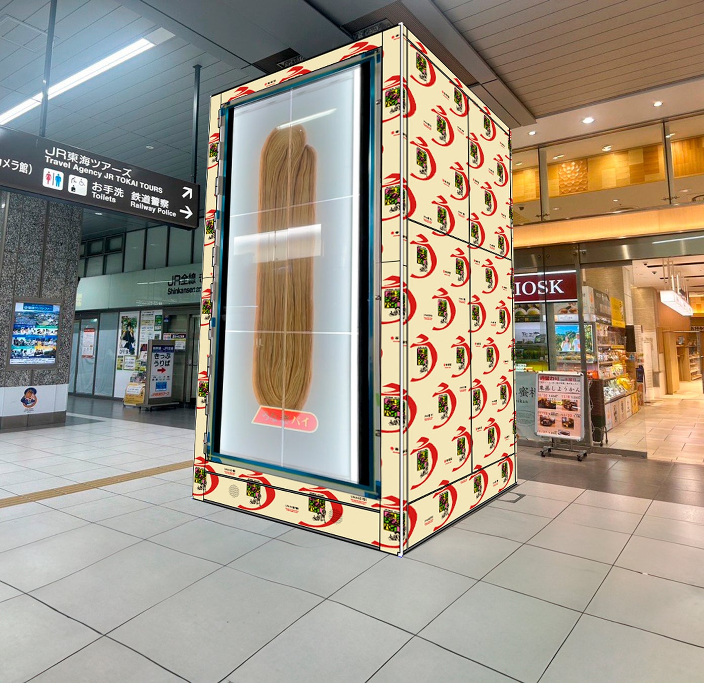 この度、多くの人々が行き交うJR浜松駅構内に、柱を1本活用した大型の透明有機ELディスプレイ使用したサイネージが新設されます。 駅柱を活用した大型サイネージは「JR東海エージェンシー」との共同開発。サイズは縦4.4m、横2mのボックス型となり、正面には透明有機ELディスプレイ(55インチ)の6面マルチディスプレイを 配置、その背面に透過性を活かして縦3m、横0.75m、奥行き8㎝のうなぎパイオブジェを格納しています。そして、筐体全体をうなぎパイの包装紙デザインで装飾を行い、大きなうなぎパイパッケージをイメージして製作しています。正面の透明有機ELディスプレイでは、中のうなぎパイオブジェを活かした映像コンテンツが放映され、大切な方との待ち合わせや、出会いの場所として浜松の新たな待ち合わせスポットになることを目指します。