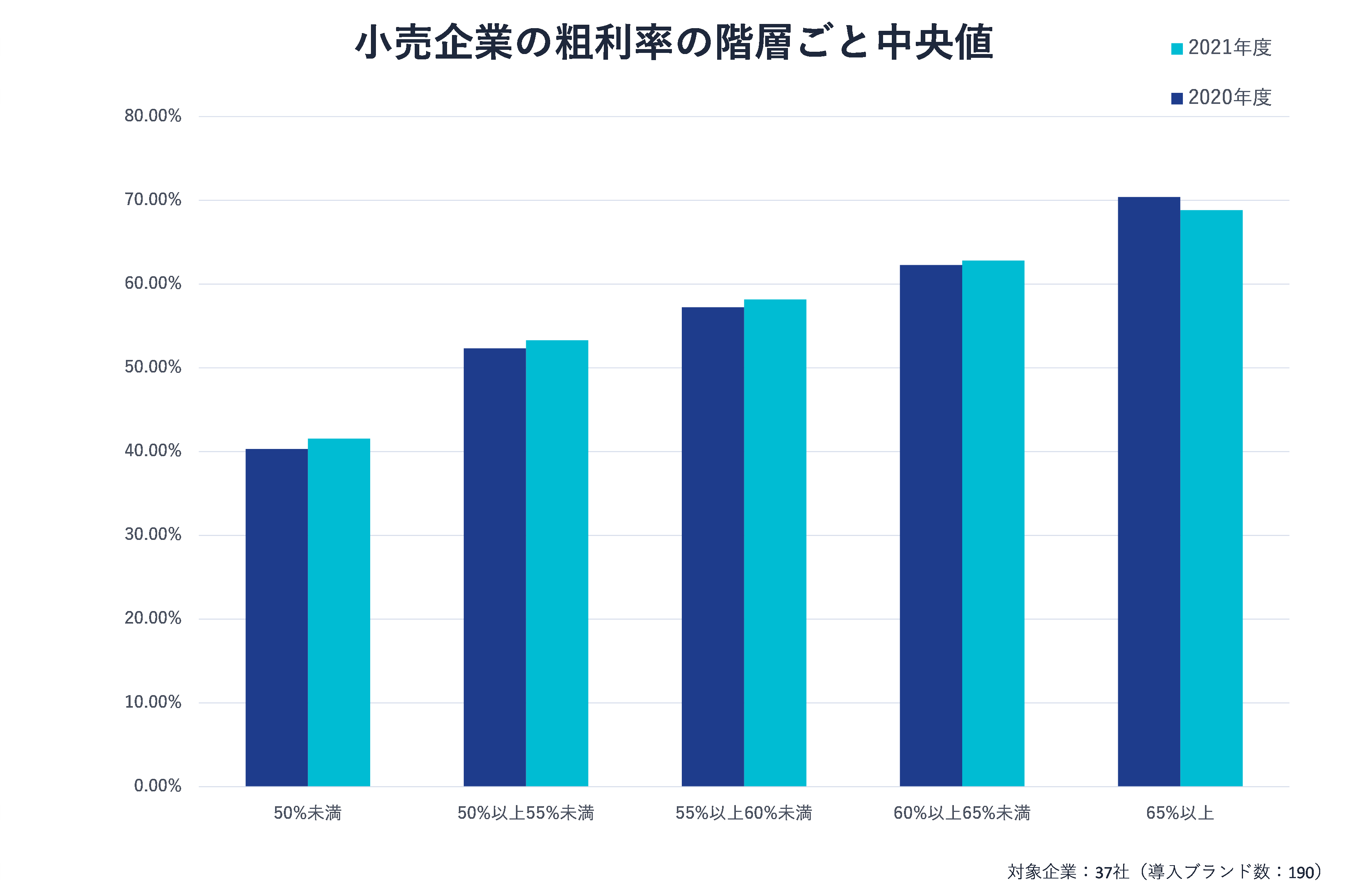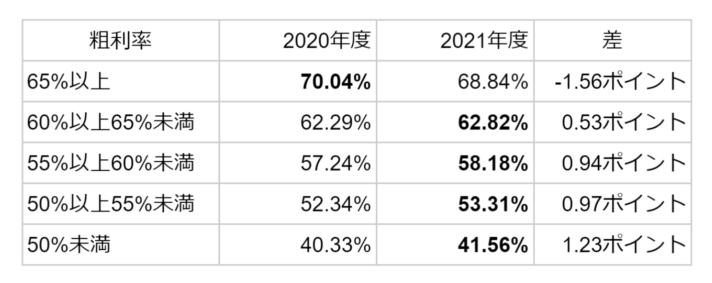 他方、粗利率が最も高い階層(65%以上)では2021年度の中央値が前年度を下回りました。この階層はもともと粗利率が65%以上と高かったこともあり、仕入れおよび値引きの抑制の効果が他の階層と比べて相対的に小さかったためとみられます。