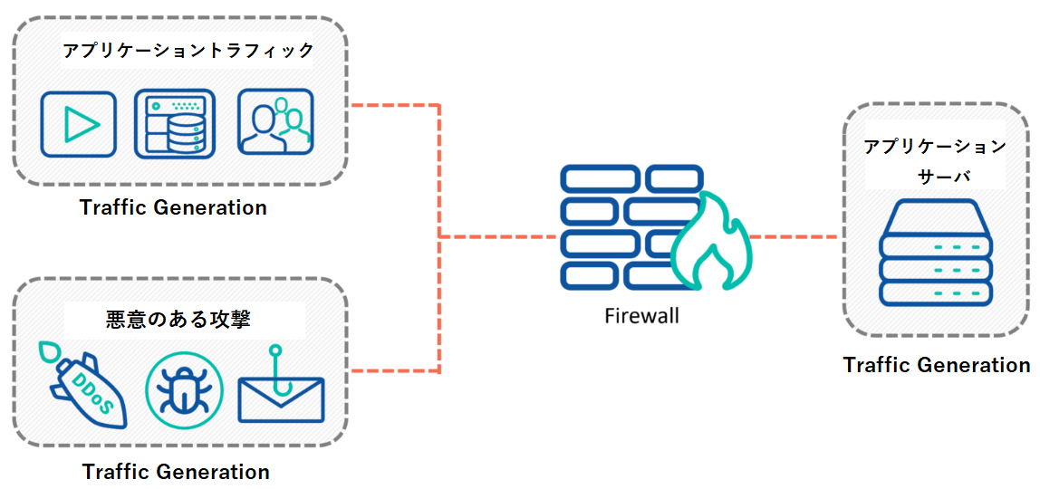 また、増え続けるさまざまな種類のサイバー攻撃の対応も急務となっており、悪意ある攻撃のパターンをファイアウォールやサーバにぶつけることで、機器の検証やサイバー攻撃時の演習(サイバーレンジ)としての利用を実現します。