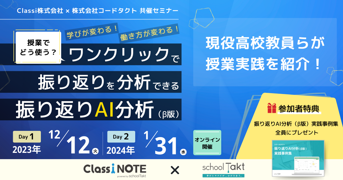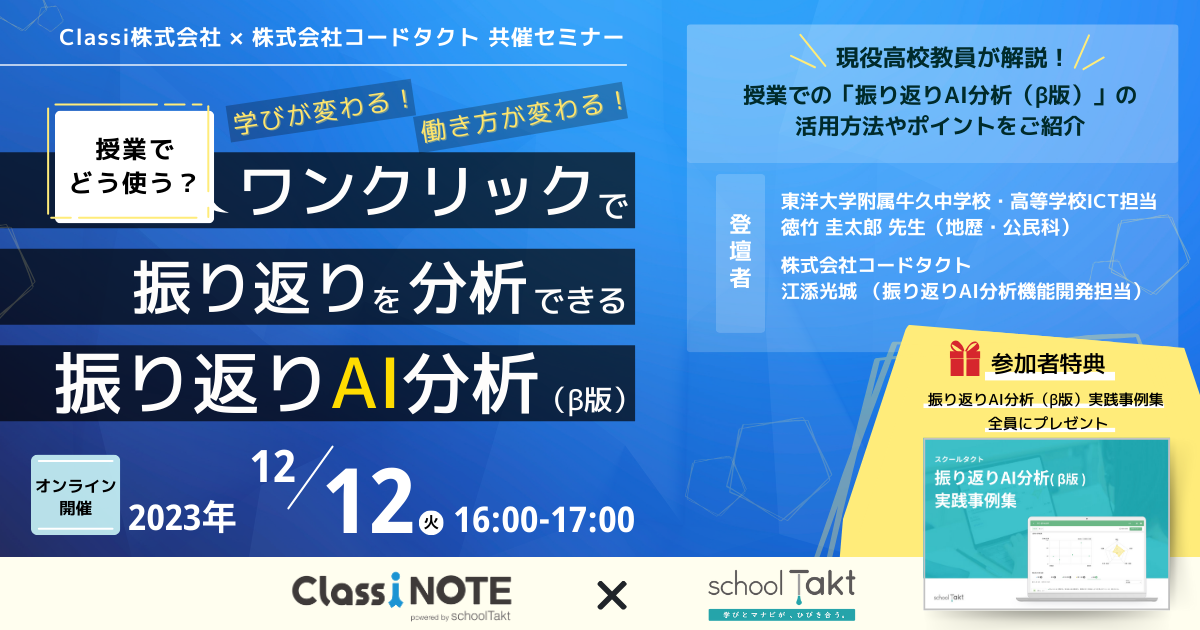 学びが変わる!働き方が変わる!「振り返りAI分析(β版)」を活用した授業実践セミナーをコードタクトとClassiが共同開催