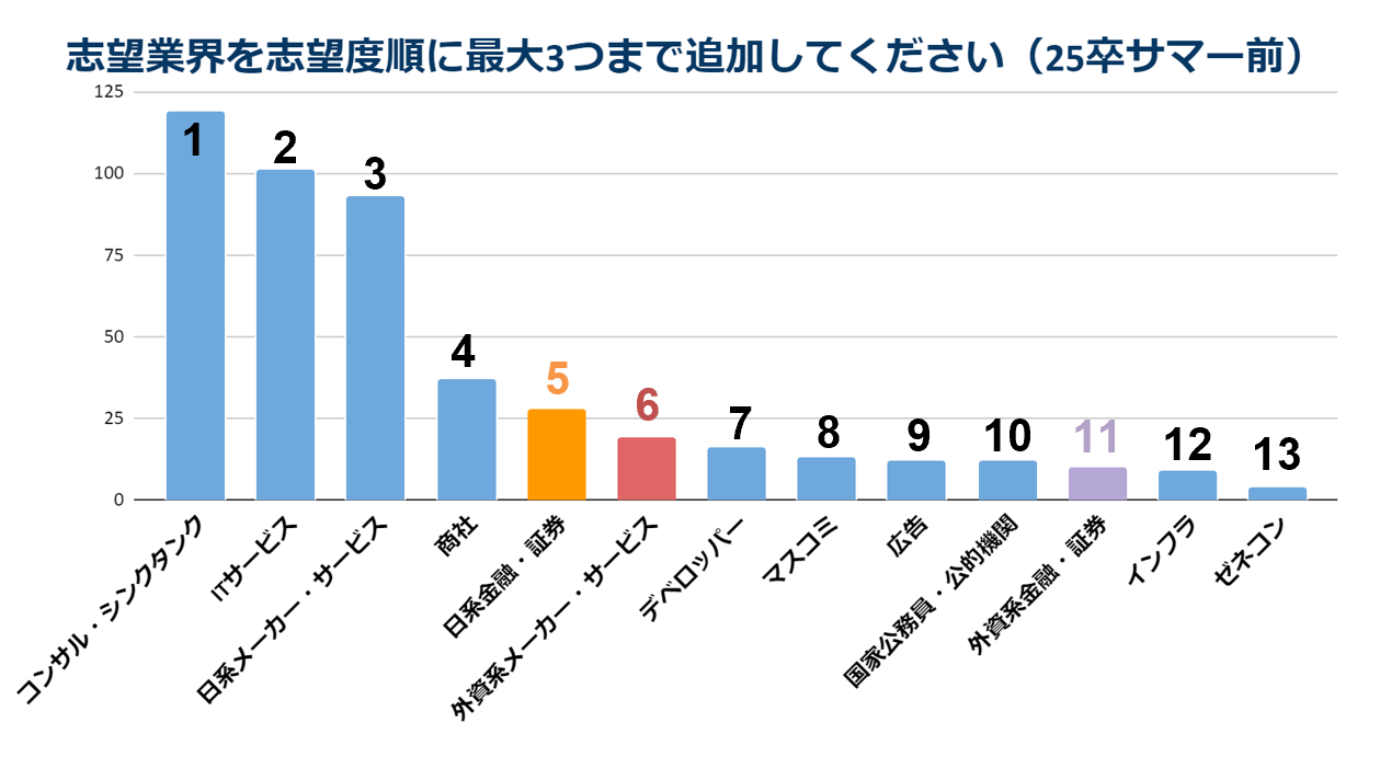 昨年の24卒調査では、外資系企業にも多くの志望が集まっていましたが、25卒学生はサマー前から「外資系メーカー・サービス」「外資系金融・証券」の人気が低い傾向にありました。市況感が就活生にも影響している可能性が高いと考えられます。