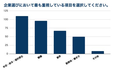 企業選びにおいて最も重視する項目は「年収・給与・福利厚生」が最多、次点で「職種」が選ばれています。