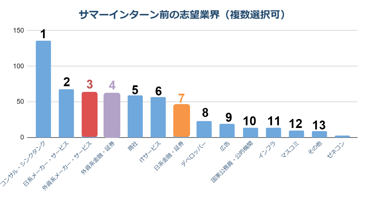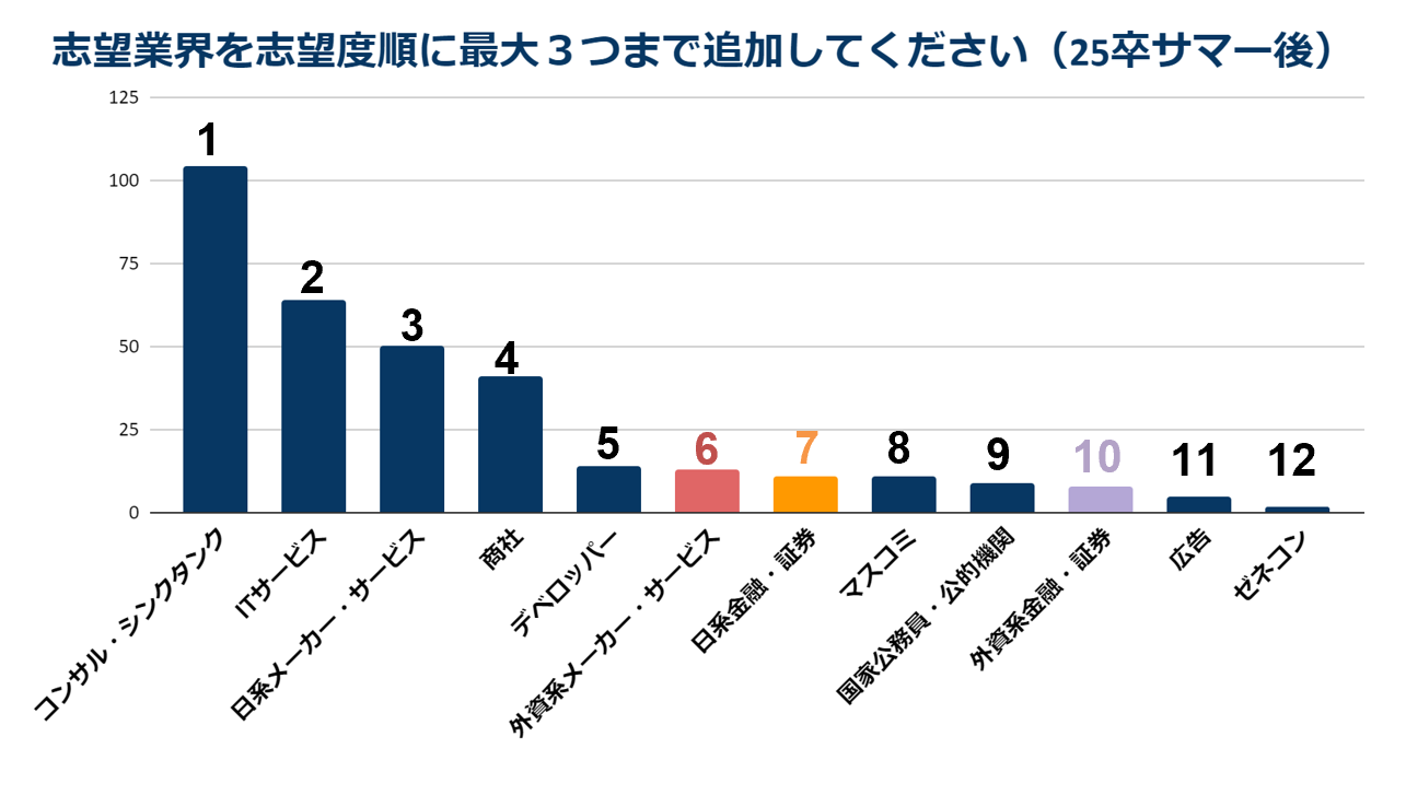 上位4業界の人気はサマーインターン前後で変化せず、「コンサル・シンクタンク」「ITサービス」「日系メーカー・サービス」「商社」の順です。サマーインターン後の調査では外資・日系ともに「金融・証券」の苦戦が目立ちます。