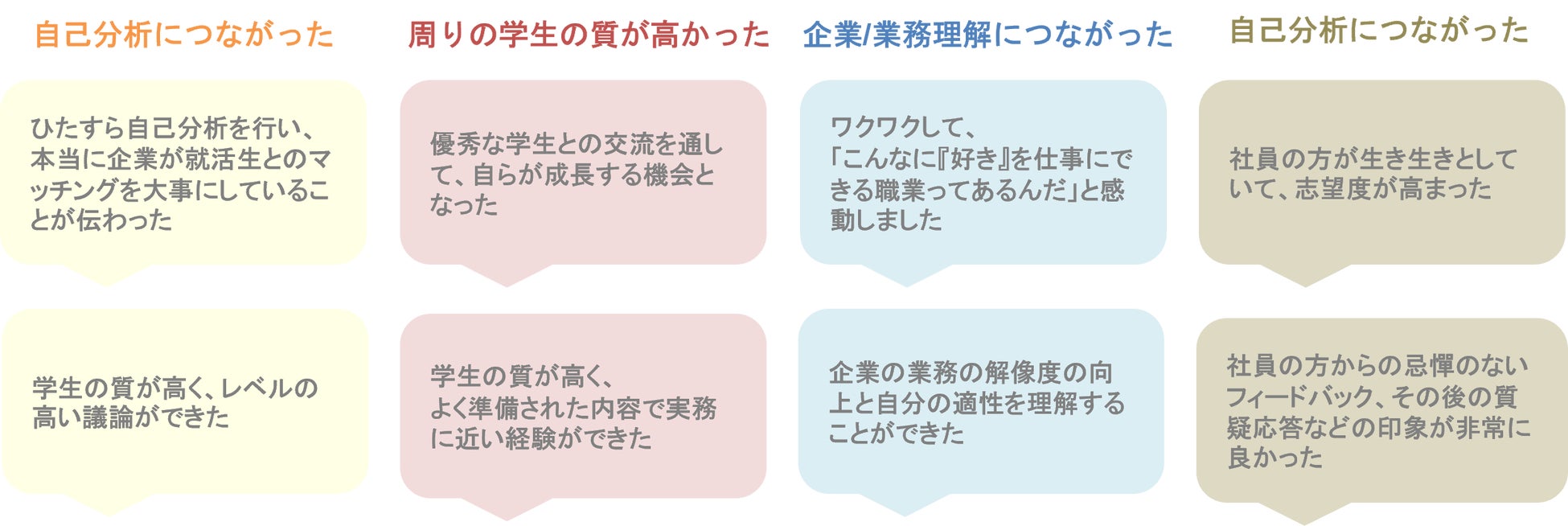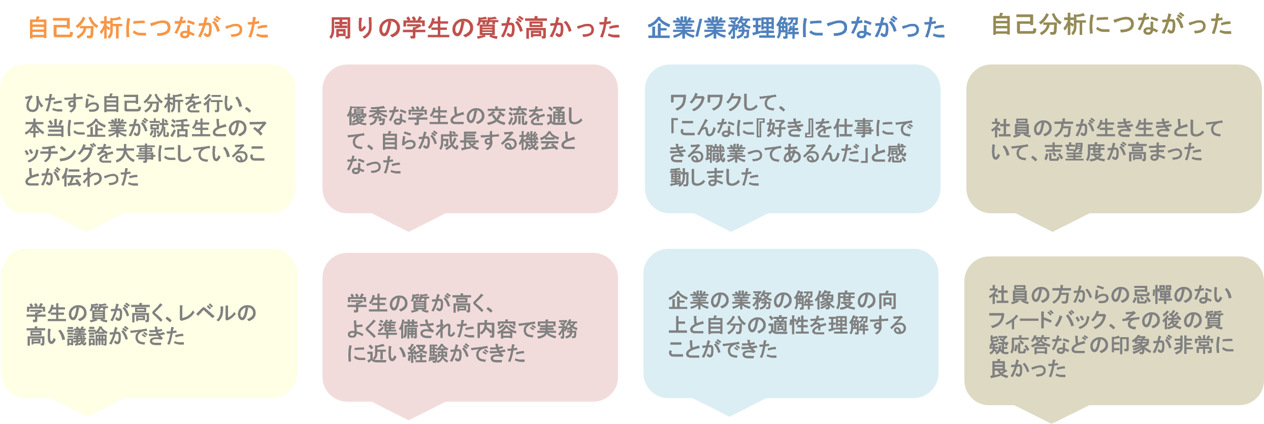 就活生に参加してよかったインターンとその理由をきくと、大きく分けて「自己分析につながった」「周りの学生の質が高かった」「企業/業務理解につながった」「社員の雰囲気/フィードバックが良かった」の4つがあげられました。