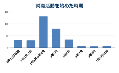 就職活動を始めた時期として最も多く回答を集めたのは、大学2年生の終わりから進級する時期である2022年3~4月でした。コンサル業界や外資系企業はサマーインターンを実施することが多いため、これらの業界志望が多い外資就活ドットコム会員は大学3年生の進級時~6月という早期に動き出していることがわかります。