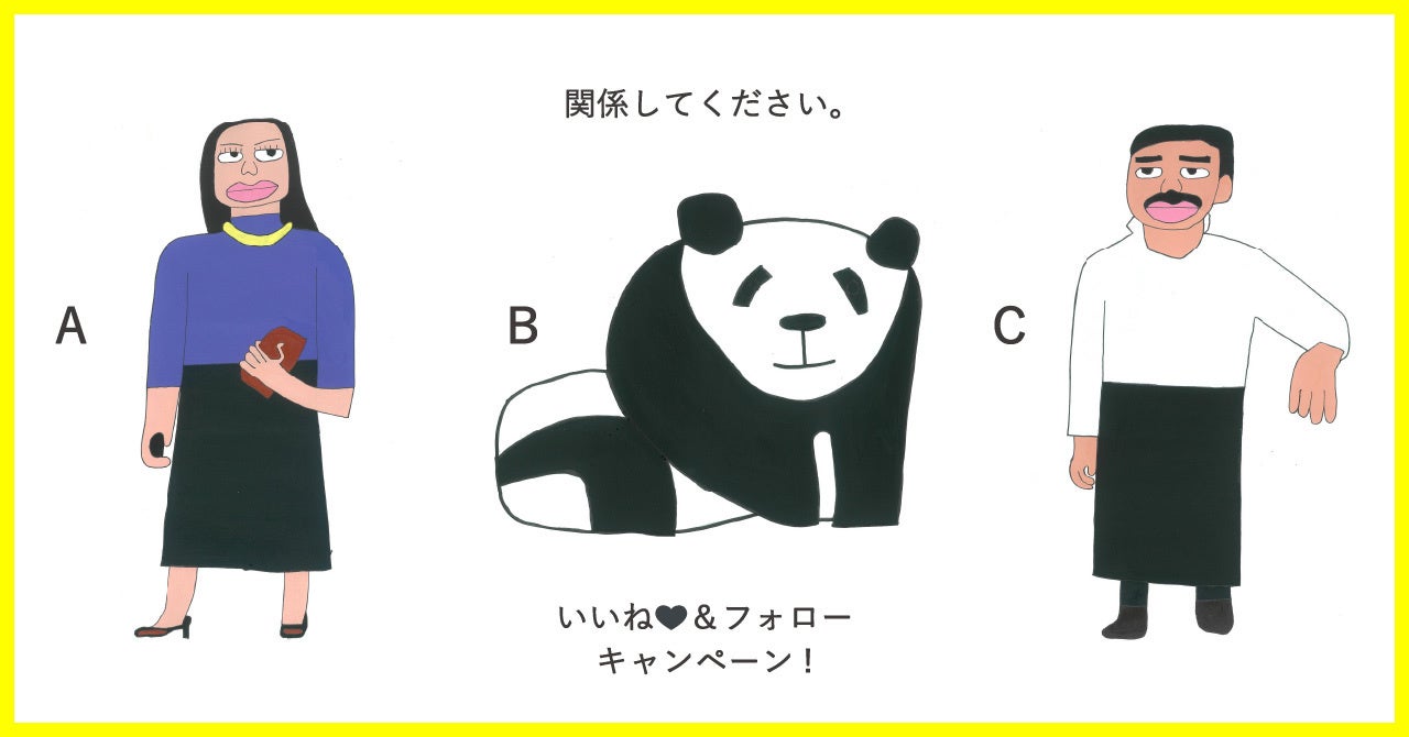 プレゼントの原画:「A:ネックレスが女の人」「B:かわいいパンダ」「C:カフェのマスター男」