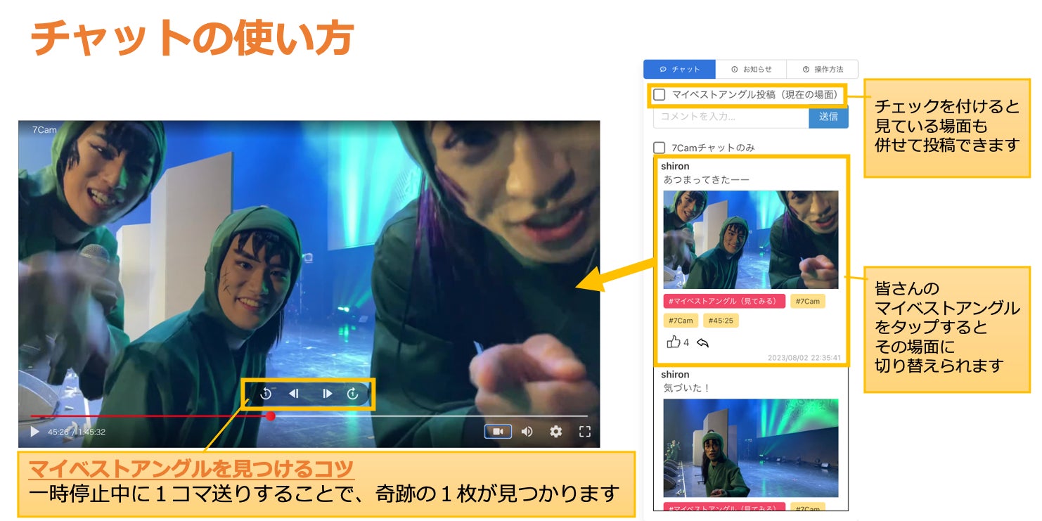 また、チャットスペースに投稿された「マイベストアングル」のサムネイルをクリックすると、タグ付けされている時刻とアングルのシーンにジャンプし該当のシーンから動画(SwipeVideo)を視聴する事ができます。(生配信中、アーカイブ配信中ともに可能)