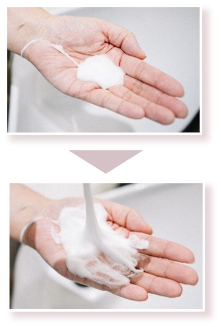 ①適量を手のひらへ出します。手で伸ばすと自然ともこもこと泡立ちます。