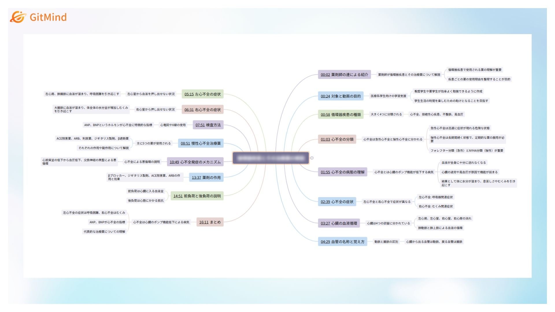 オンライン講座・講義のノート作成: 講義動画を文字起こしし、重要なポイントをマインドマップにまとめ、効率的な復習と知識定着を促進。