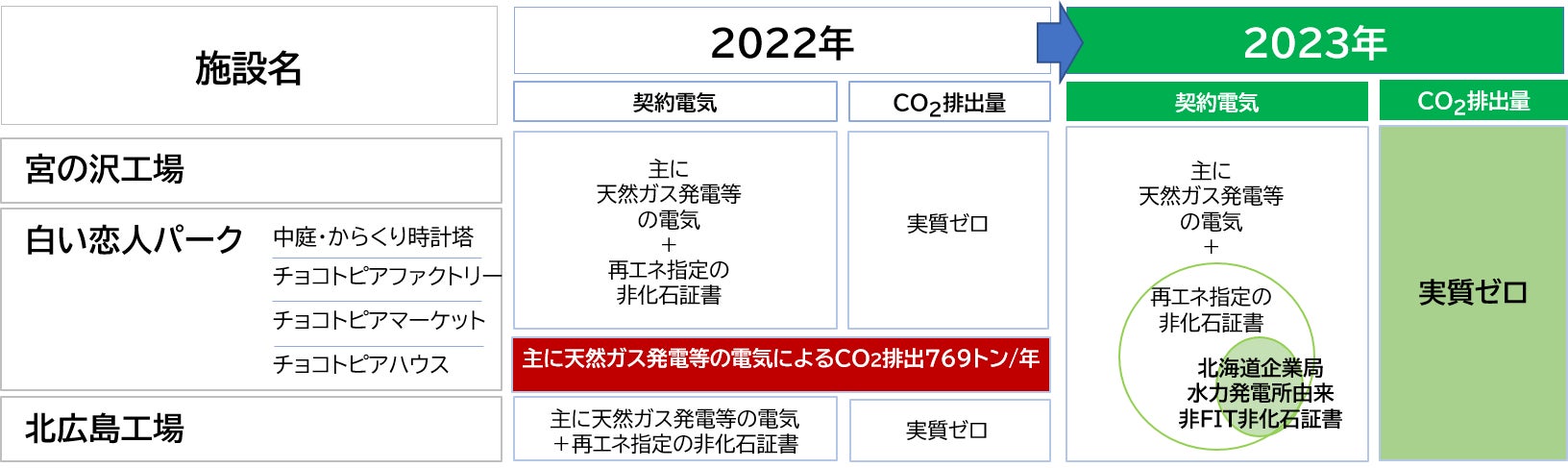 さらに、本年4月に白い恋人パークの一部、7月には宮の沢地区および北広島工場において北海道企業局の水力発電所(非FIT*)由来の非化石証書による環境価値を“地産地消”することにより、残り年間769トン排出していたCO2もゼロとし、同社敷地内全施設における電力利用によるCO2排出量の実質ゼロを実現したものです。