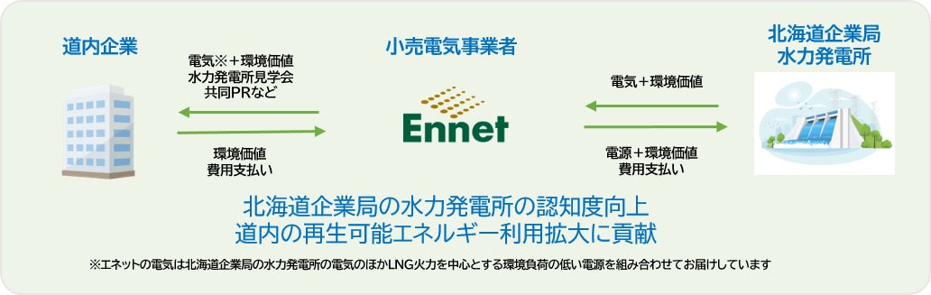 エネットは、道内企業向けに北海道企業局が運営する水力発電所(非FIT)由来の環境価値による“環境価値の地産地消”を提案し、事業活動におけるCO2削減を支援するとともに、実際に北海道の豊かな水資源を利用した発電所を見学いただく機会等を提供いたします。これら、道民の環境問題に対する意識啓発を北海道企業局と共同で実施することで、継続的に道の提唱する“ゼロカーボン北海道”に貢献してまいります。