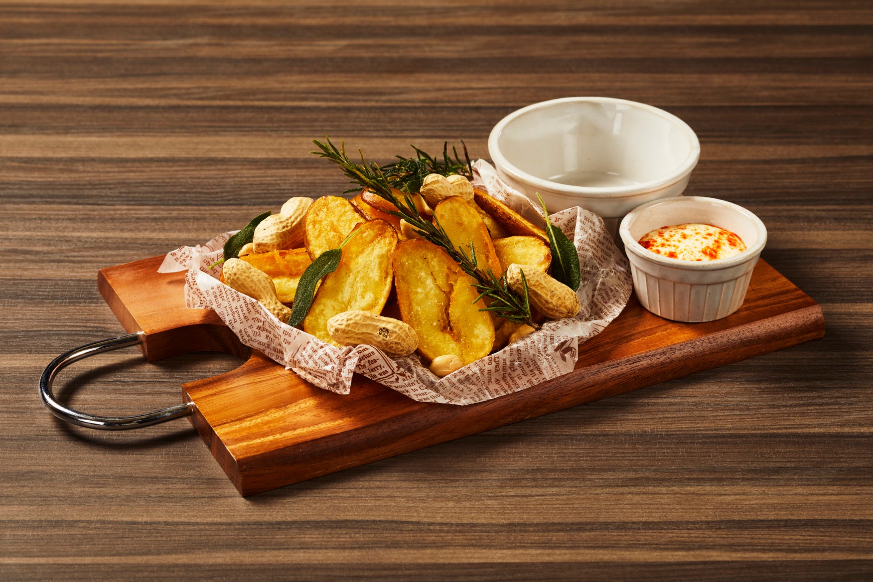単なるフライドポテトではなく、素揚げしたハーブを混ぜたアイオリソースにディップしてお召し上がりください。