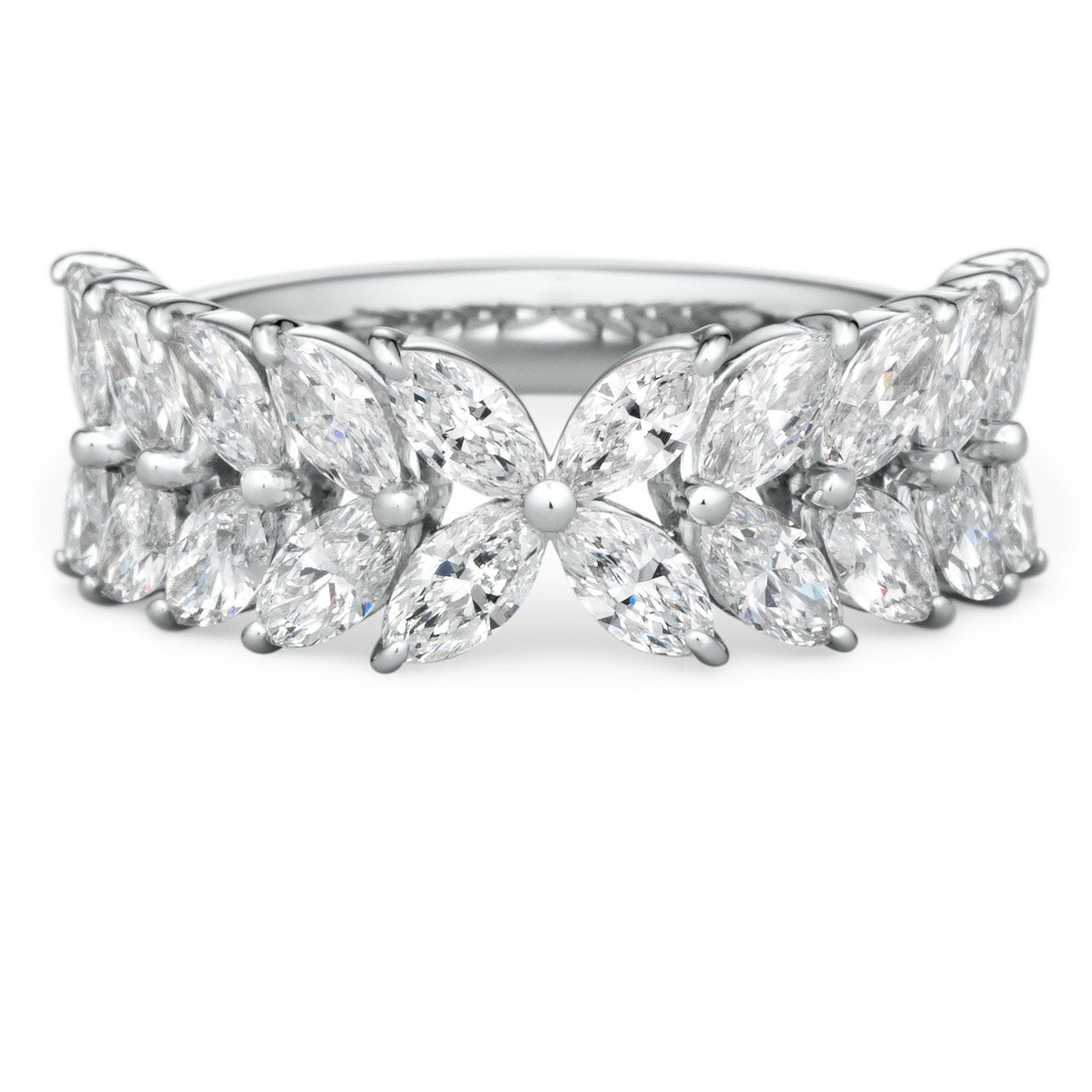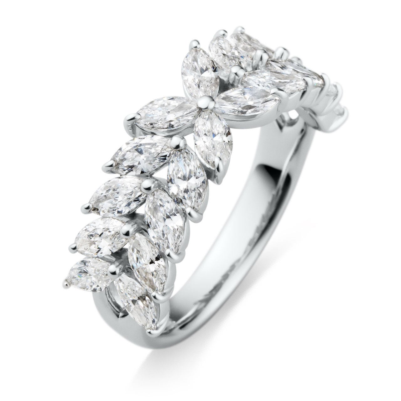 『フォリア』はマーキスカットのダイヤモンドを、永遠を象徴する月桂樹の葉をイメージしあしらったエタニティリング。生命の息吹を思わせる立体感ある造りが、指元にモダンさと堂々とした風格をもたらします。ごく小さく仕上げた爪によって、マーキスカットの優美な表情を存分に堪能していただけます。