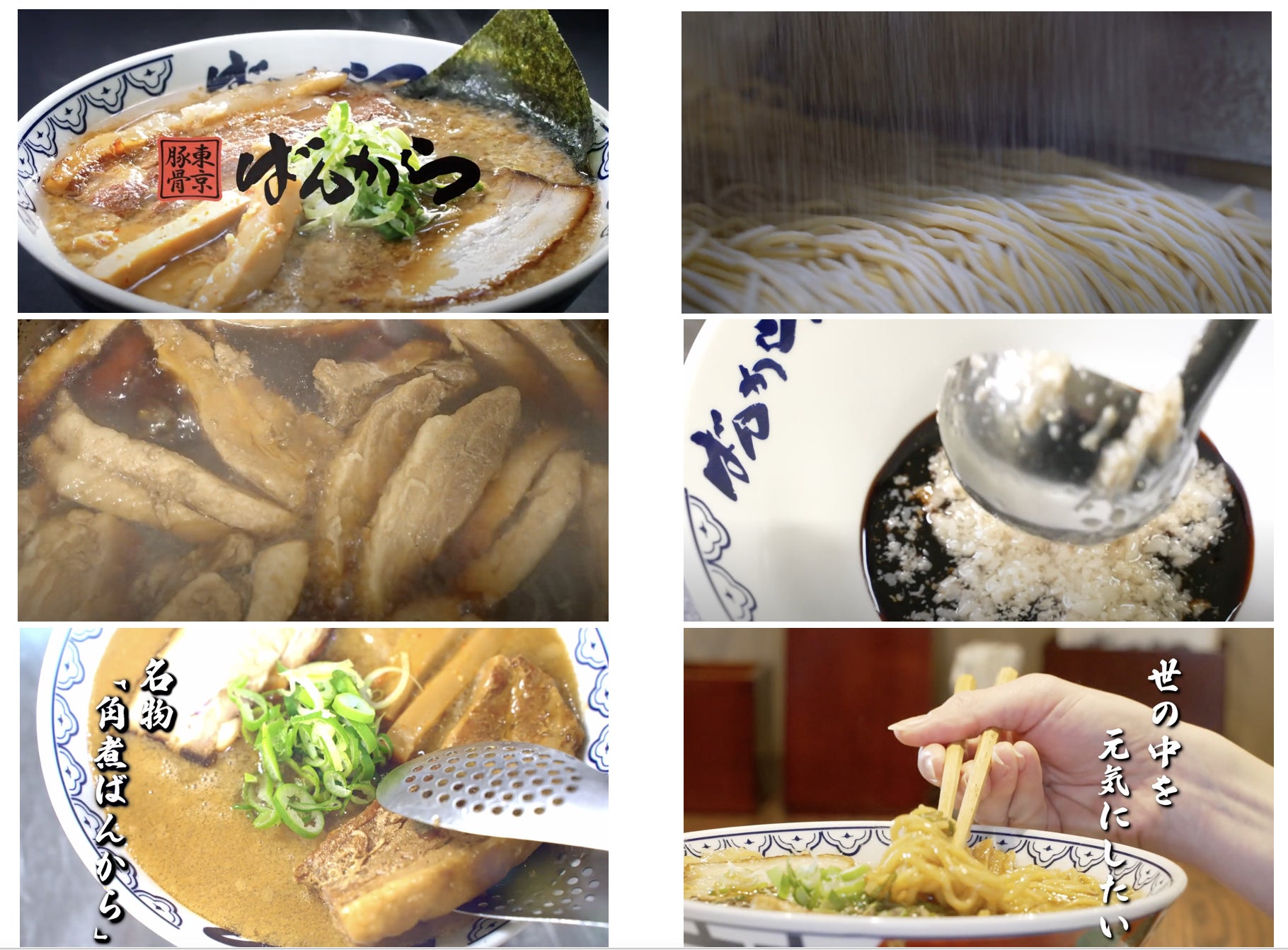 今回の動画は、世の中をラーメンで元気にしたい、ばんからのラーメンづくりへのこだわりを細部まで知っていただける内容となっており、全てのラーメンメニューそれぞれの味の方向性やスープに合わせて開発している自社開発麺の製造工場風景や、毎朝店舗でトロトロになるまで煮込んでいる創業当初からのシグネチャーメニュー<角煮ばんから>のトッピングでもある角煮の仕込みシーンなど、1杯のラーメンをお出しするまでのこだわりを感じていただける映像となりました。