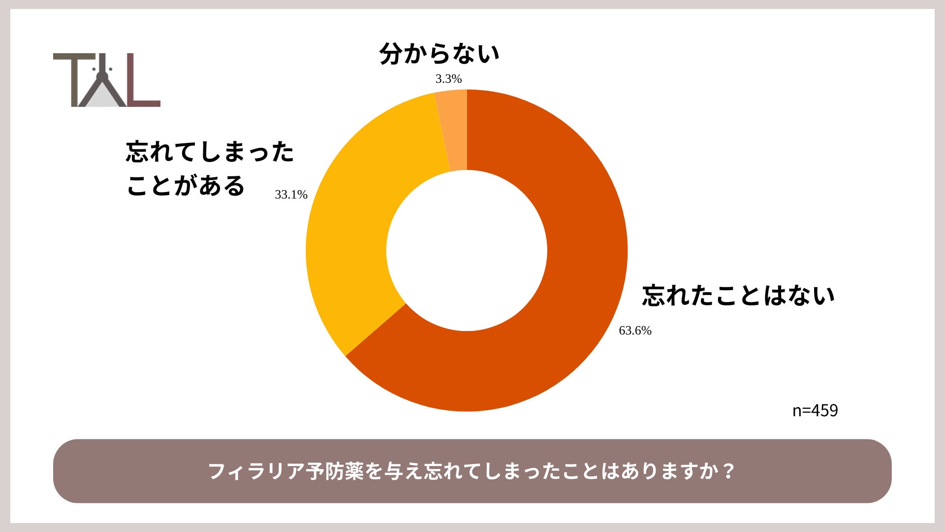 Q2で「予防薬を与えていない」または「分からない」と回答した飼い主をのぞく459名の飼い主に対して「フィラリア予防薬を与え忘れてしまったことはありますか?」と質問したところ、「忘れたことはない」と回答した飼い主が63.6%と半数を超えました。一方で、3割以上の飼い主が予防薬を与えることを「忘れてしまったことがある」(33.1%)という実態も見えてきました。