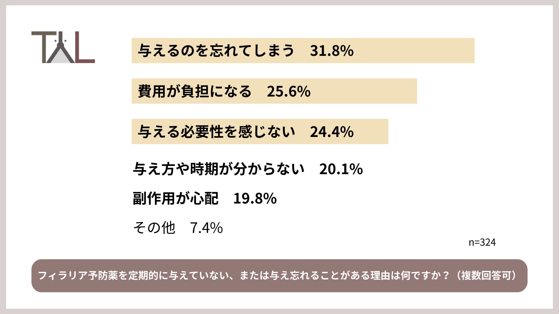 フィラリア予防薬を定期的に与えていない、または与え忘れることがあると回答した飼い主324名に対して「フィラリア予防薬を定期的に与えていない、または与え忘れることがある理由は何ですか?」と質問したところ、31.8%の飼い主が「与えるのを忘れてしまう」と回答しました。そのほかに「費用が負担になる」(25.6%)、「与える必要性を感じない」(24.4%)、「与え方や時期が分からない」(20.1%)といった回答も見られ、フィラリア予防の重要性や予防方法に関する知識が浸透していないケースも見られました。