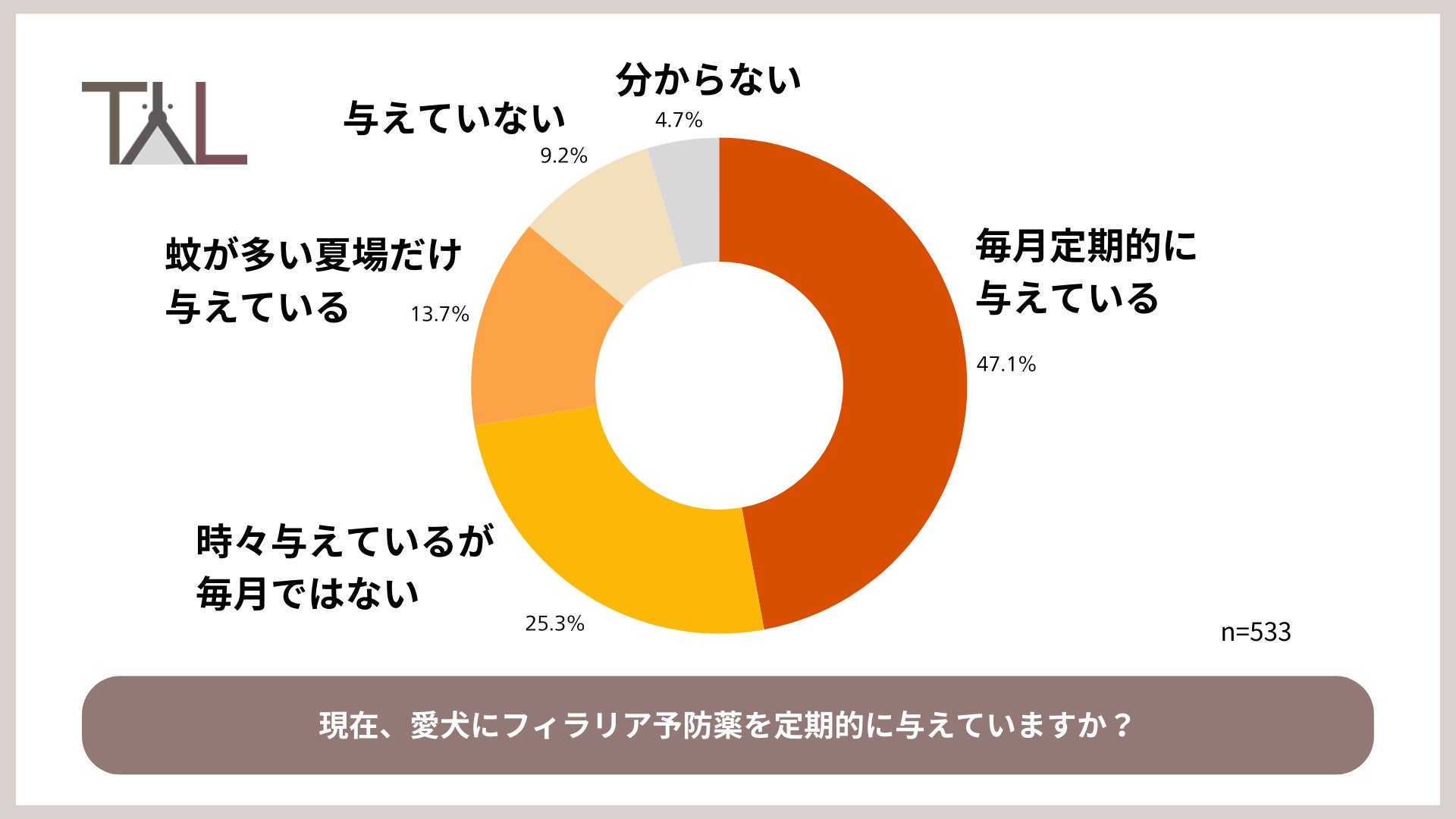 フィラリアの認知度は9割を超え、約半数の飼い主が毎月定期的に予防薬を投与している。