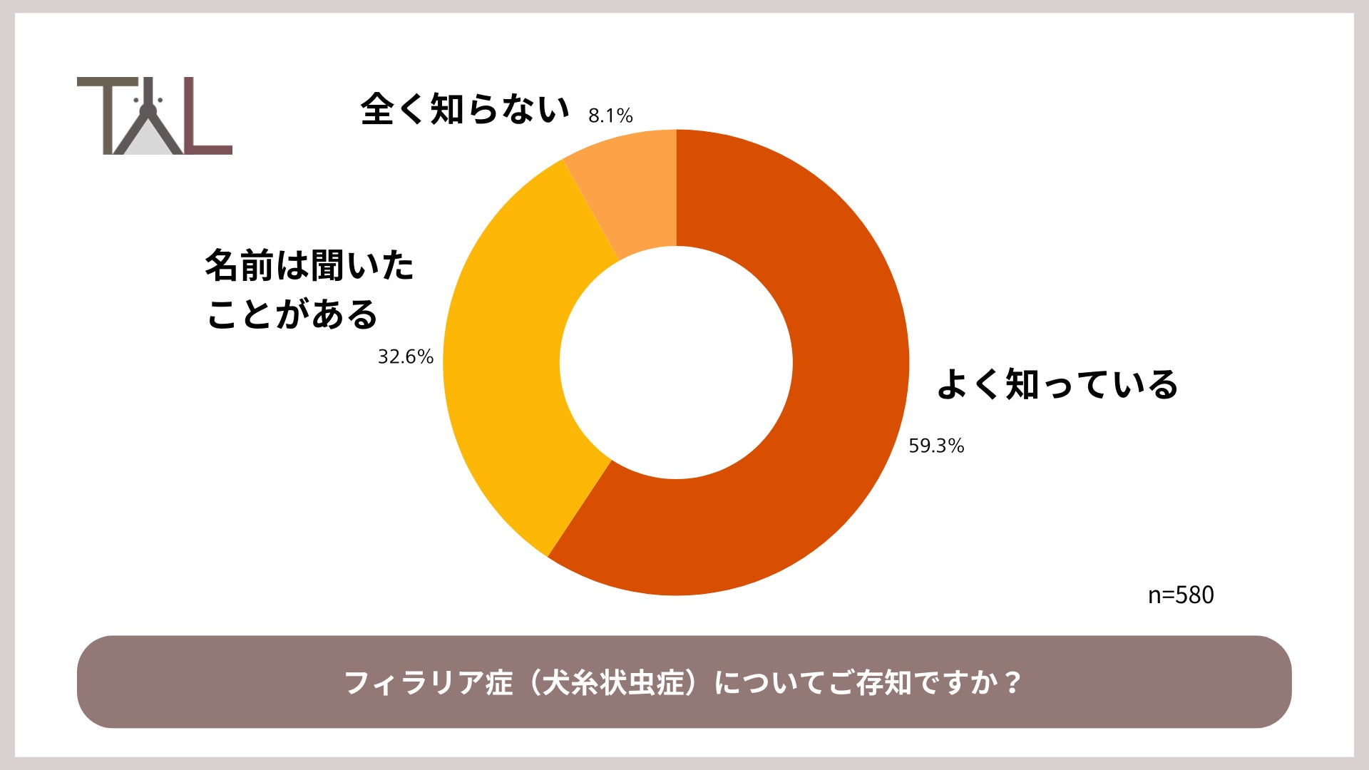 犬の飼い主580名に対し「フィラリア(犬糸状虫症)についてご存知ですか?」と質問したところ、「よく知っている」(59.3%)、「名前は聞いたことがある」(32.6%)、「まったく知らない」(8.1%)という結果に。フィラリアに対する認知度は9割を超えていることがわかりました。